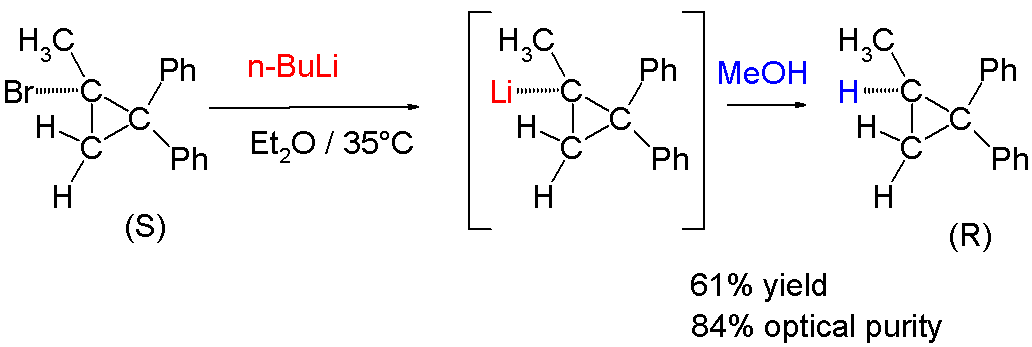 같은 방식으로 (+)-(''S'')-''l''-브로모-''l''-메틸-2,2-디페닐시클로프로판과 ''n''-부틸리튬을 반응시킨 후 메탄올로 퀜칭하면 배위 유지를 가진 생성물이 얻어졌다.[24]
