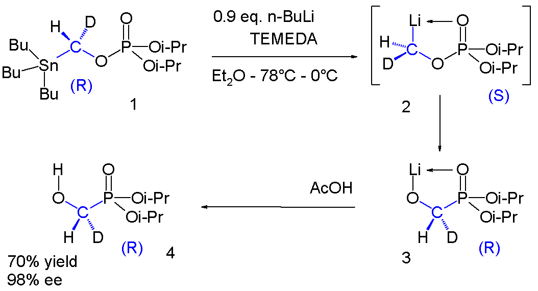 유기인 화학에서 인산염 '''1'''은 수소와 중수소 치환기를 가진 키랄 그룹을 포함한다. 스타닐 그룹은 리튬으로 치환되어 중간체 '''2'''가 되며, 이 중간체는 인산염-포스포란 전위를 거쳐 포스포란 '''3'''이 되고, 이것이 아세트산과 반응하여 알코올 '''4'''를 생성한다. 다시 한번 -78°C에서 0°C 범위에서 이 반응 시퀀스에서 키랄성이 유지된다. (에난티오선택성은 Mosher산으로 유도체화 후 핵자기 공명 분광법으로 측정되었다.)