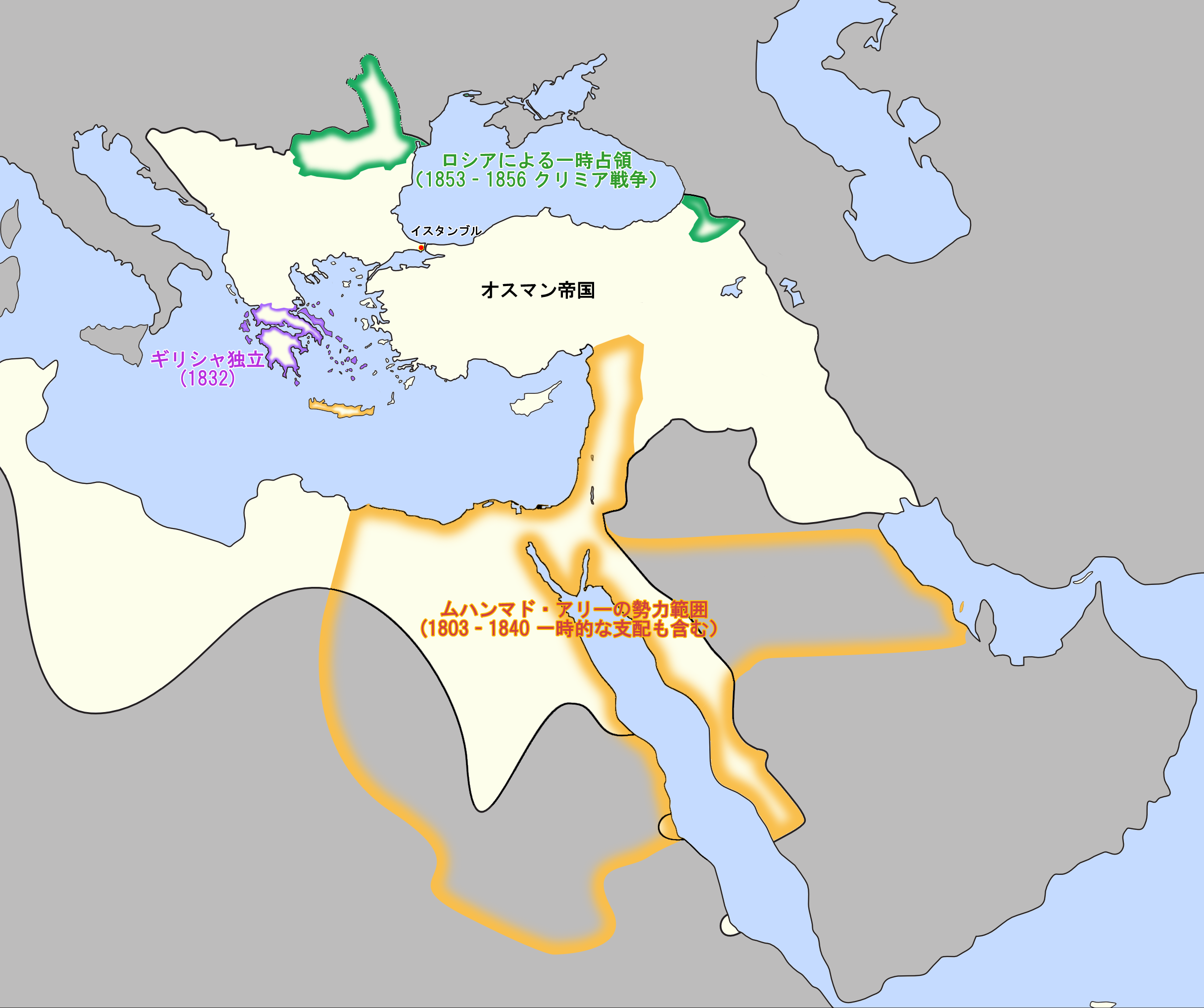 마흐무트 2세는 강력한 의지로 개혁을 추진하여 1826년 오랜 군벌이었던 예니체리를 마침내 해체하고 군대 서구화, 정부 기구 근대화, 인재 양성 등에 힘썼다.[45] 하지만 그리스 독립 전쟁(1821-1829)에서 제국의 무력함이 드러났고, 진압을 도운 이집트 총독 무함마드 알리와의 갈등이 깊어졌다.[45][46] 무함마드 알리가 그리스 독립 전쟁 지원의 대가로 시리아 통치권을 요구하자 마흐무트 2세는 이를 거부했고, 이는 제1차 이집트-오스만 전쟁으로 이어졌다.[45] 이집트 군대가 아나톨리아까지 진격하자 다급해진 오스만 제국은 러시아 제국에 도움을 요청했고, 결국 영국과 프랑스의 개입으로 1833년 퀴타히야 조약을 맺어 시리아를 이집트에 넘겨주어야 했다.[45] 또한, 이집트 문제에서 영국의 지지를 얻기 위해 외무대신 무스타파 레시트 파샤는 1838년 영국과 불평등한 내용의 발리타 리마누 조약(오스만-영국 통상 조약)을 체결했는데, 이는 이후 영국이 다른 아시아 국가들과 맺는 유사한 조약들의 선례가 되었다.[36][37] 시리아를 둘러싼 갈등은 1839년 제2차 이집트-튀르크 전쟁으로 다시 불붙었고, 오스만 군대는 또다시 패배했다. 마흐무트 2세는 이 패전 소식이 수도에 닿기 직전 병으로 세상을 떠났다.[32][36][45]