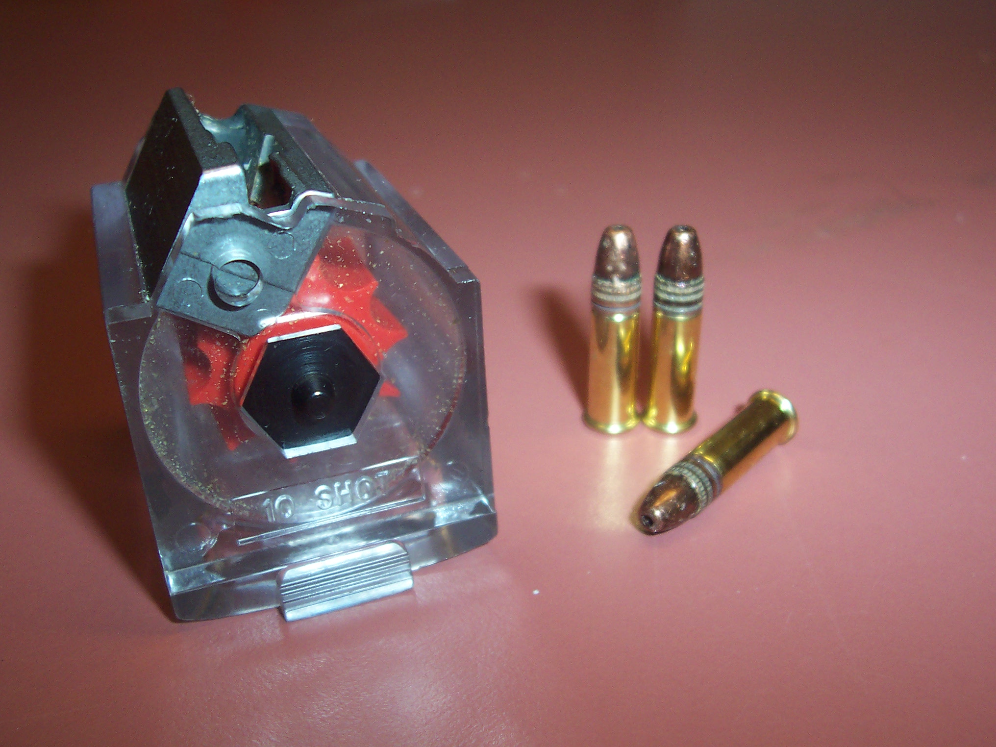 장전 슬리브가 열린 상태, 헨리 평탄탄 3발, .44 WCF 탄과 비교