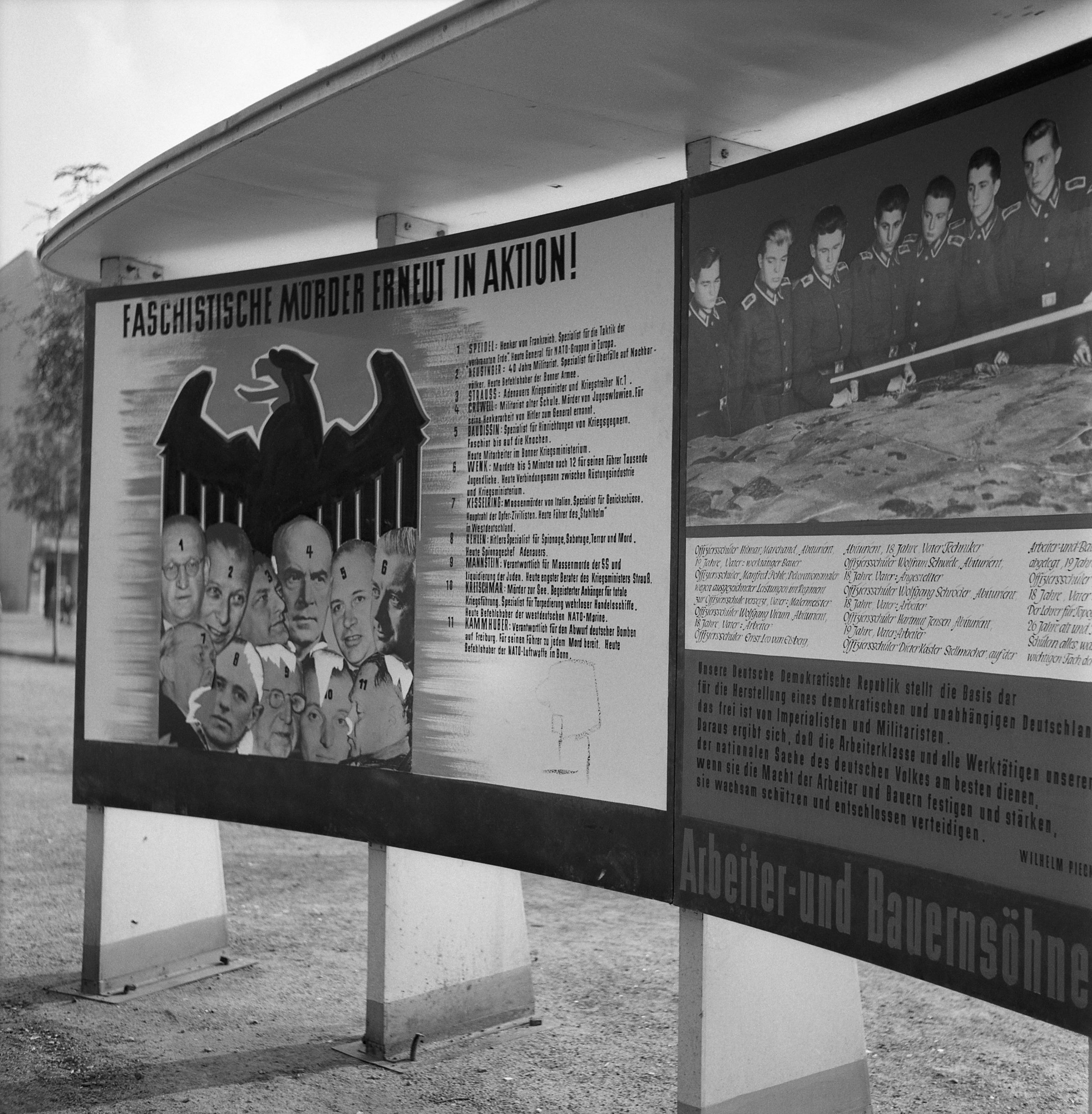 서독에 대한 선전 캠페인의 일환으로, 테오도어 오버랜더와 한스 글로브케는 두 사람 모두 대량 학살에 연루된 전직 나치 지도자였으며, 동독에서 처음으로 비난받은 연방 정치인들 중 하나였다. 두 사람은 1960년 4월과 1963년 7월에 동독에 의해 부재 상태에서 종신형을 선고받았다.[61] 특히 서독 대통령 하인리히 뤼브케는 부헨발트 강제 수용소와 작센하우젠 강제 수용소 해방 기념식에서 동독의 국립 기념관에서 비난받았다.[62]