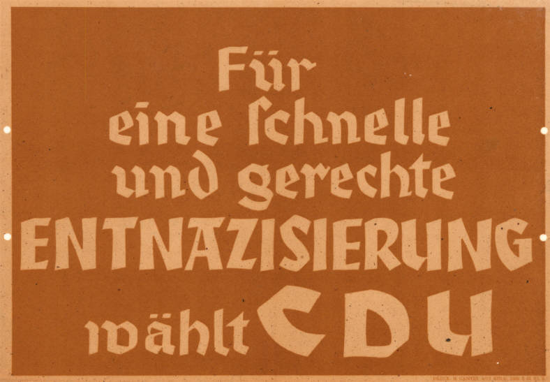 1946년 1월, 영국은 탈나치화 위원회를 독일인에게 이양했다.[71] 1947년 노르트라인-베스트팔렌 주 선거 포스터에는 "신속하고 공정한 탈나치화를 위해 CDU에 투표하십시오"라는 슬로건이 적혀있다.