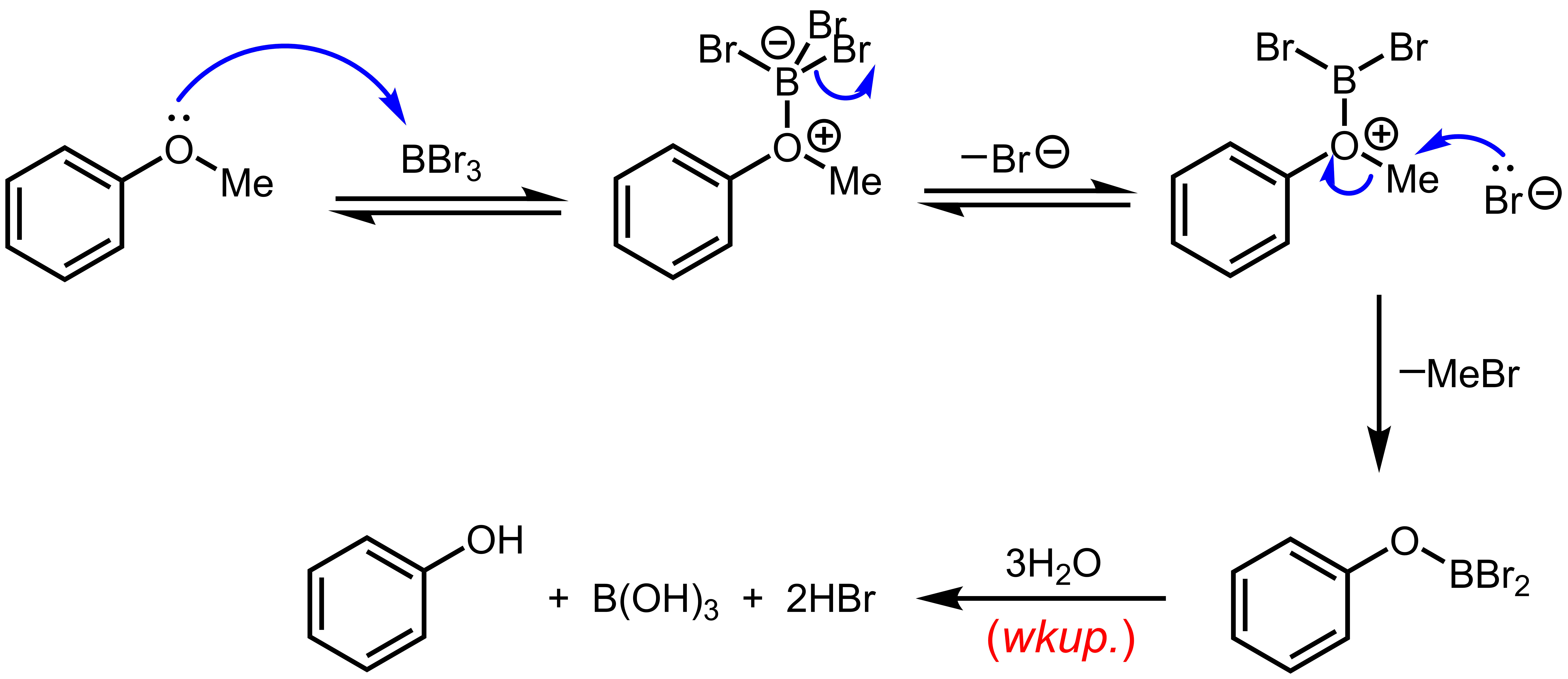 실온 이하에서 사용할 수 있는 삼브로민화 붕소는 아릴 메틸 에터의 탈메틸화에 더 특화된 시약이다. 에터 탈알킬화의 메커니즘은 강한 루이스 산인 BBr3와 루이스 염기인 에터 사이의 루이스 산-염기 부가물의 초기 가역적 형성을 통해 진행된다. 이 루이스 부가물은 가역적으로 해리되어 다이브로모보릴 옥소늄 양이온과 Br–를 생성할 수 있다. 에터 결합의 파열은 Br–에 의한 옥소늄 종에 대한 후속적인 친핵성 공격을 통해 일어나며 아릴옥시다이브로모보레인 및 브로민화 메틸을 생성한다. 반응이 완료되면 수성 워크업 동안 다이브로모보레인 유도체의 가수분해시 붕산(H3BO3) 및 브로민화 수소산(aq. HBr)과 함께 페놀이 유리된다.[45][19]