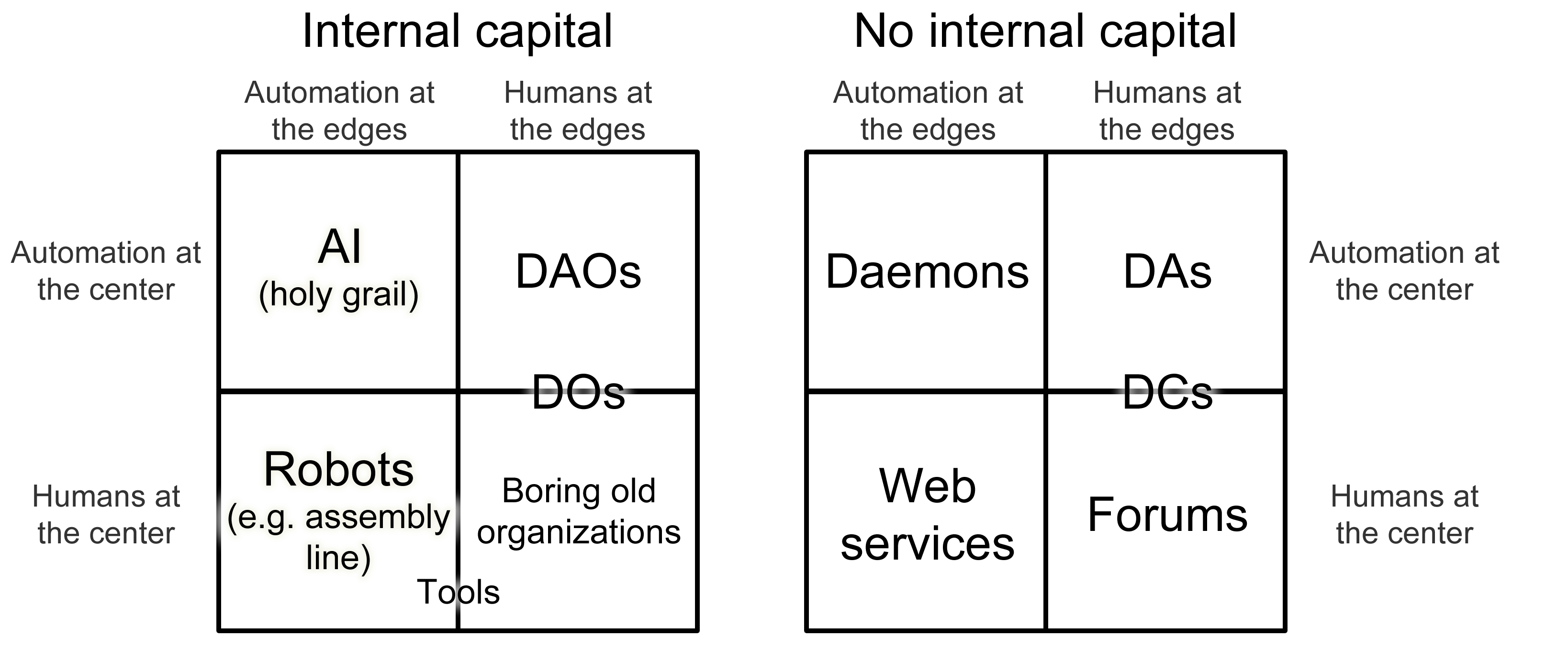 비탈릭 부테린이 제시한 DAO 분류를 위한 사분면 차트에 따르면, 탈중앙조직(DO)과 탈중앙자율조직(DAO)의 주요 차이점은 내부 자본의 유무이다. DAO는 특정 행동에 대한 보상으로 주어지는 내부 자산을 보유하고 그 가치를 활용할 수 있다. 이러한 관점에서 비트토런트는 내부 자산이 없고, 메이드세이프와 같은 시스템은 평판 체제를 가지지만 그 평판은 판매 가능한 자산이 아니다. 반면, 비트코인과 네임코인은 내부 자산을 가지고 있다.[1]