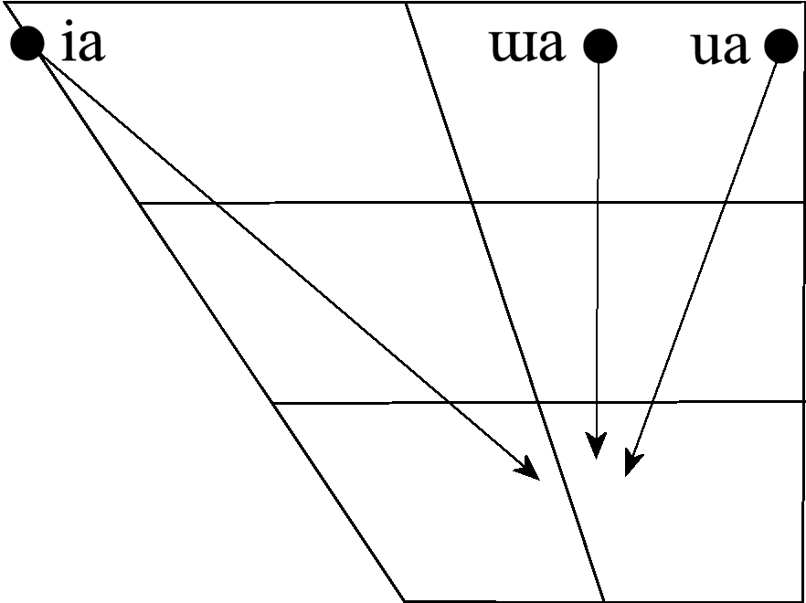 마찰음과 유성음 자음에서는 유성과 무성의 2성 대립(two-way voiced vs. voiceless distinction)이 있었고, 파열음과 파찰음에서는 최대 4성 대립(four-way distinction)이 있었다. 최대 4성 대립은 순음(/p pʰ b ʔb/)과 치경음(/t tʰ d ʔd/)에서 나타났으며, 연구개음(/k kʰ ɡ/)과 경구개음(/tɕ tɕʰ dʑ/)에서는 성문 폐쇄음을 포함한 3가지 대립이 있었는데, 각 집합에서 성문화된 구성원은 없는 것으로 보인다.