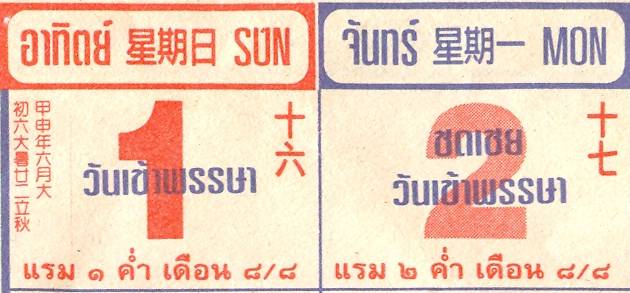 태국 태양력에서 평일은 서로 다른 이름을 갖고 있지만, 태국 태음력에서는 달이 차고 이지러지는지에 따라 2가지 기간에서 1일부터 14일 또는 15일까지 순서대로 번호를 매긴다. 예를 들어 '램 십하 캄 드안 십송'(แรม ๑๕ ค่ำ เดือน ๑๒th)은 "달이 이지러지는 음력 12월 15일 저녁"을 의미한다.[1]