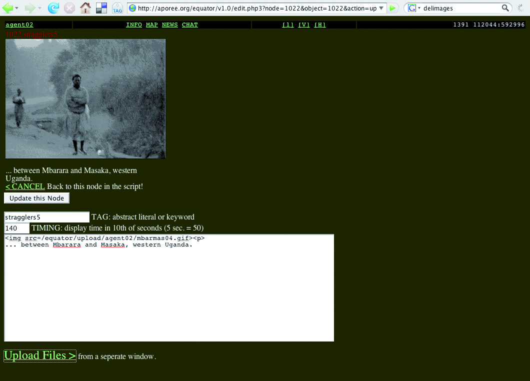 "적도와 다른 세계에 대한 설명", documenta X가 제작한 협업 하이퍼시네마 포털, 1997. 사용자가 '태그'라는 용어와 연결된 미디어를 업로드하는 페이지
