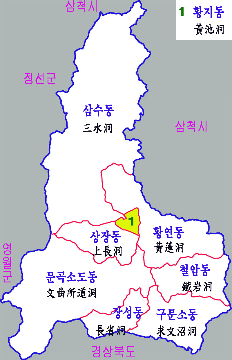 - 1963년 6월 25일: 삼척군 장성읍 적각리, 황지리, 소도리, 혈리, 통리, 창죽리, 화전리에 황지출장소 설치[14]