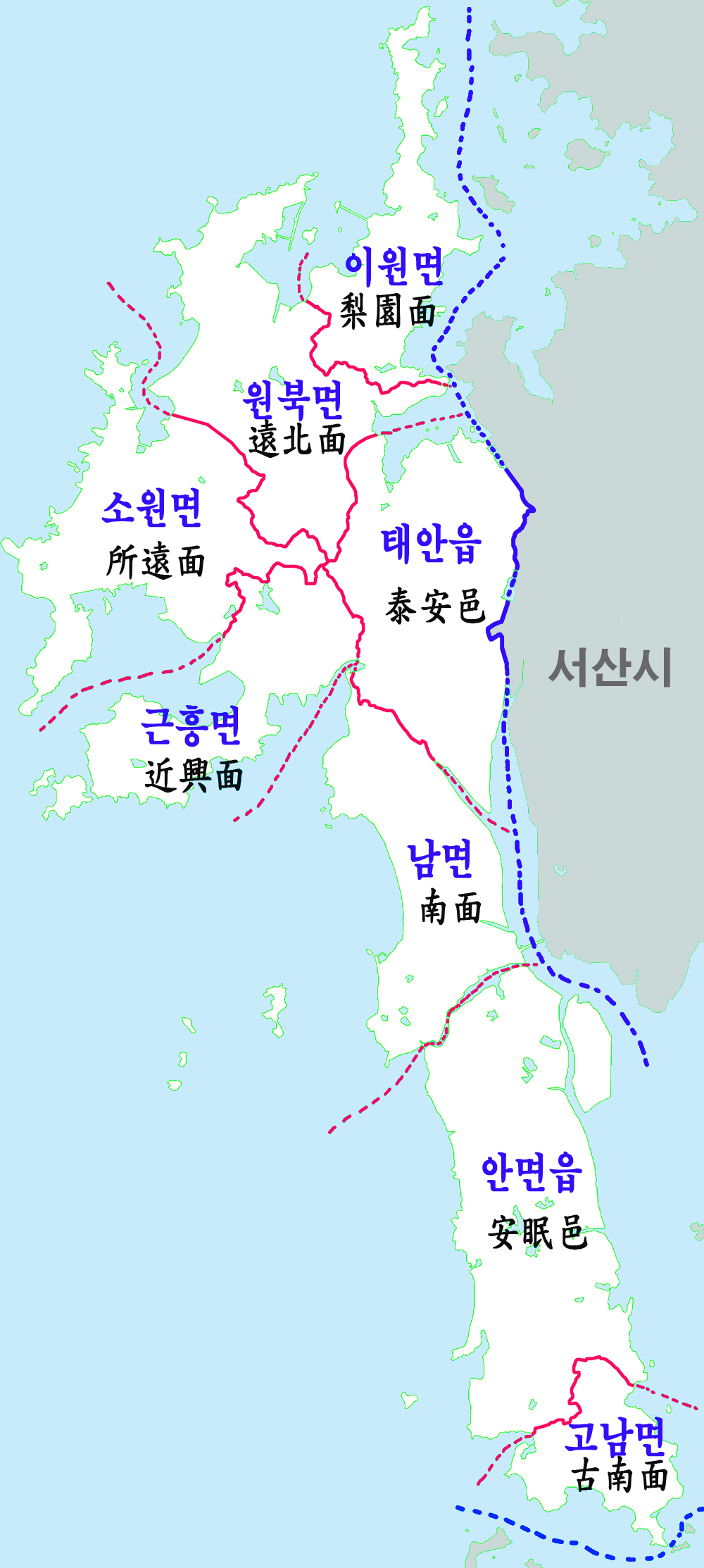 근흥면 | 近興面 | 2,958 | 5,714 | 52.97km2 |