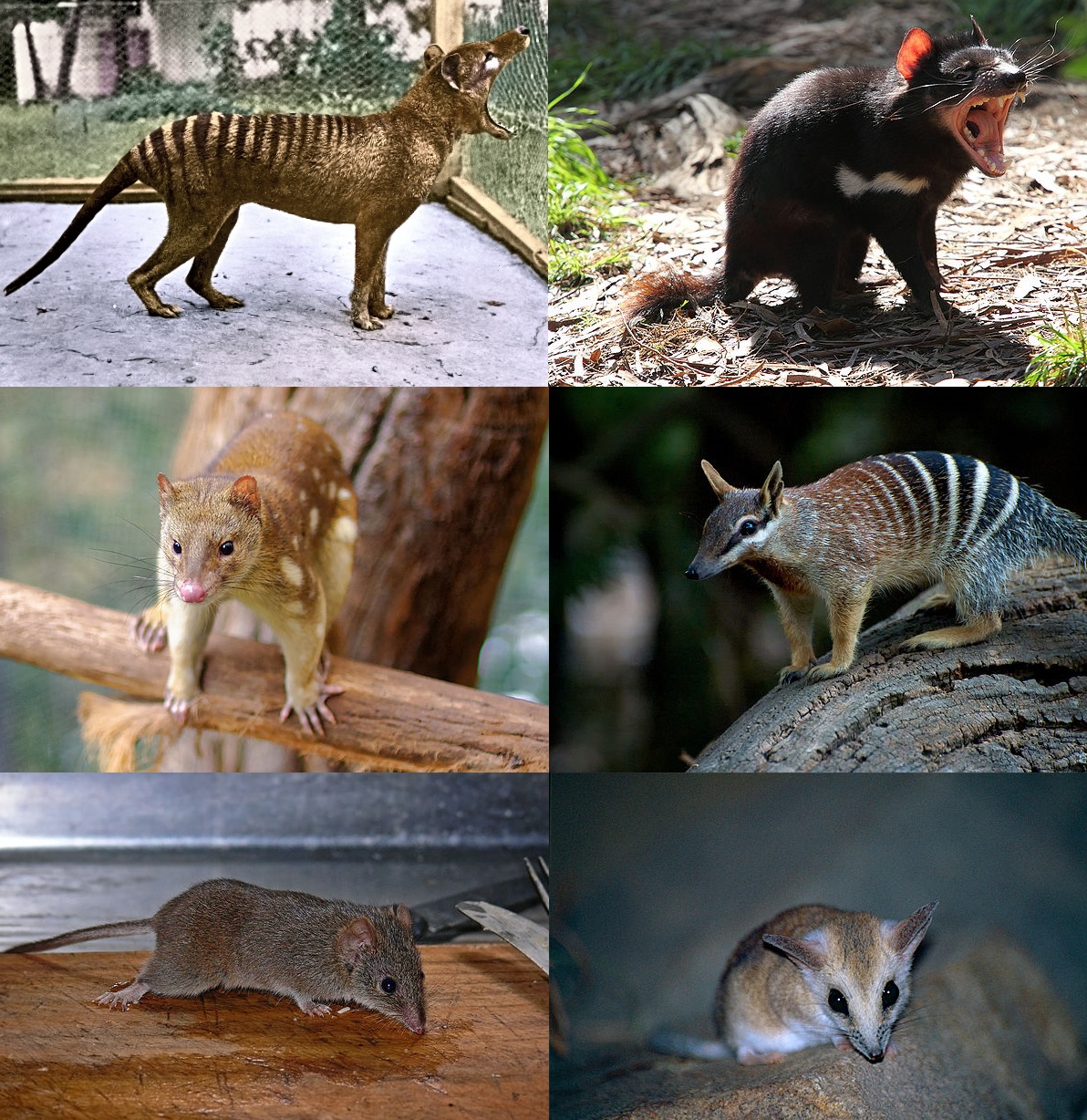틸라시누스(Thylacinus) 속의 유일하게 기록된 종인 태즈메이니아주머니늑대는 개과 동물과 외형이 유사한 포식성 유대류였다. 짧은 털을 가진 큰 개와 비슷했으며, 캥거루처럼 몸에서 부드럽게 이어지는 뻣뻣한 꼬리를 가졌다.[22]