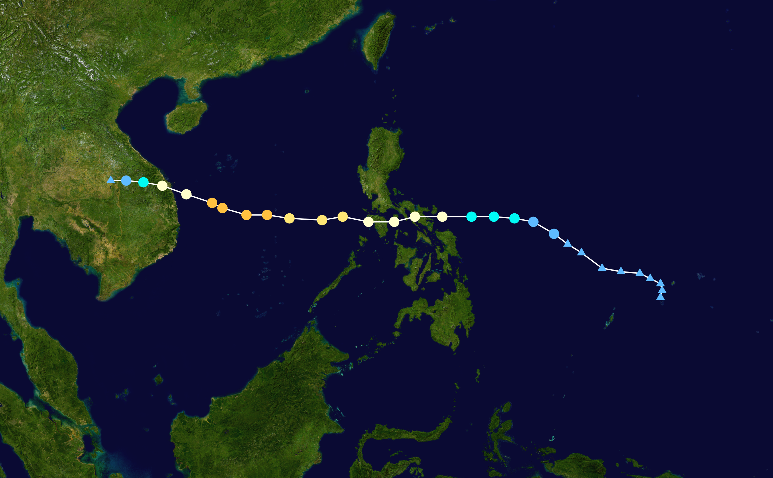 남중국해에서 서진하며 급격히 발달하여 10월 27일경 '매우 강' 등급 태풍으로 최성기를 맞이했다.[1] 이후 서북서쪽으로 이동하며 베트남 해안으로 접근했고, 10월 28일 베트남 꽝응아이 성 부근에 상륙했다.[14][1] 베트남 내륙을 통과하면서 육상 마찰로 인해 급격히 약화되었으며, 10월 29일캄보디아 부근 육상에서 열대저압부로 소멸하였다.[1]