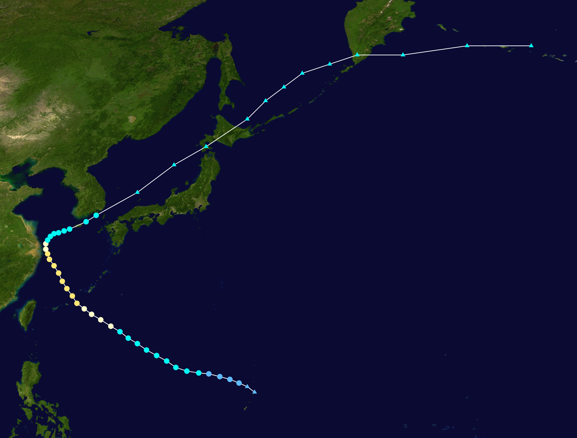 9월 1일, 동중국해를 지나며 대한민국 남쪽 중위도 저기압과 상호 작용, 온대 저기압 전환을 시작했다. 풍속 시어 증가로 태풍 중심 노출, 대류가 북쪽, 동쪽으로 이동했다. 전진 속도 둔화, 북쪽으로 방향 전환하며 대한민국 대부분 지역에 장기간 폭우를 야기했다. JTWC는 9월 1일 말 아그네스가 온대 저기압으로 변했다고 추정, 태풍 강도 이하 약화 시점과 일치했다.[1] JMA는 북서쪽 이동 시작, 열대성 시스템으로 유지했다. 약화된 사이클론은 9월 3일 대한 해협 통과, 그날 오후 온대 저기압 전환 완료했다. 동해 가속, 잔해 폭풍은 9월 4일 홋카이도 북부 일본 섬 상륙 전 약간 깊어져, 추정 기압 976mbar였다. 오호츠크해 통과 후, 9월 5일 러시아 캄차카 반도 영향, 이후 북태평양 해역 지나, 9월 6일 날짜 변경선 부근에서 마지막 관찰되었다.[2]
