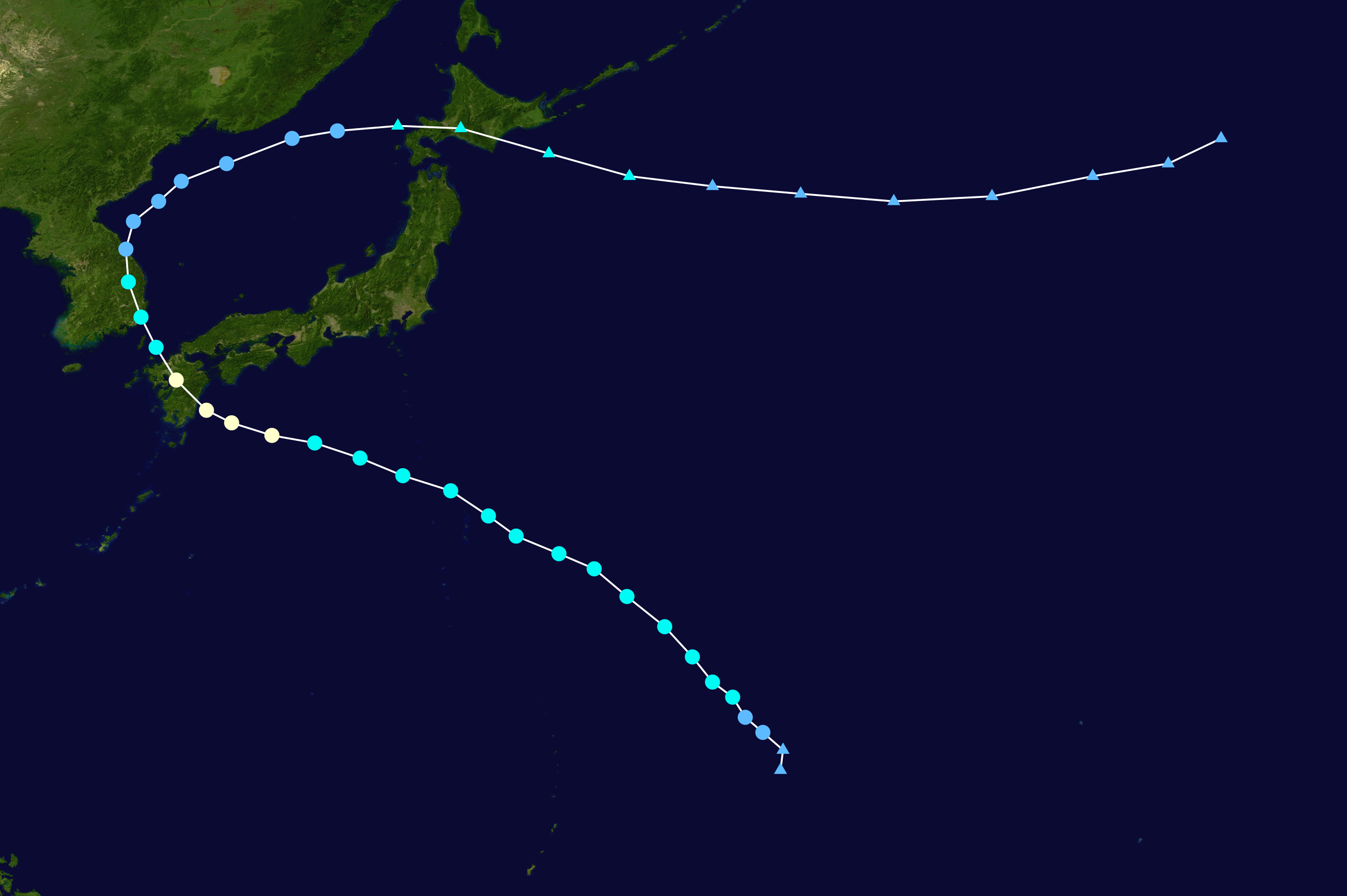 일본 기상청(JMA) 기준으로는 8월 6일 오후 10시에서 오후 11시 사이에 중심기압 998hPa, 최대풍속 18m/s, 강풍 반경 170km의 세력 '약', 크기 '소형'의 열대 폭풍으로 울산광역시 부근 육상에 상륙하였다. 이후 8월 7일 0시에 경상북도 경주시 부근 육상을 지나, 오전 3시에 봉화군 부근 육상을 중심기압 1000hPa, 최대풍속 18m/s, 강풍 반경 170km의 세력 '약', 크기 '소형'의 열대 폭풍으로 통과하였고, 오전 6시에 강원도 정선군 부근 육상을 통과하였다. 강원도 정선군 부근 육상을 통과한 뒤 동해상으로 진출한 이후 약화되어서 8월 7일 오전 9시에 강원도 양양군 남동쪽 약 31km 부근 해상(동해)에서 중심기압 1000hPa의 열대저압부로 소멸하였다.[7]