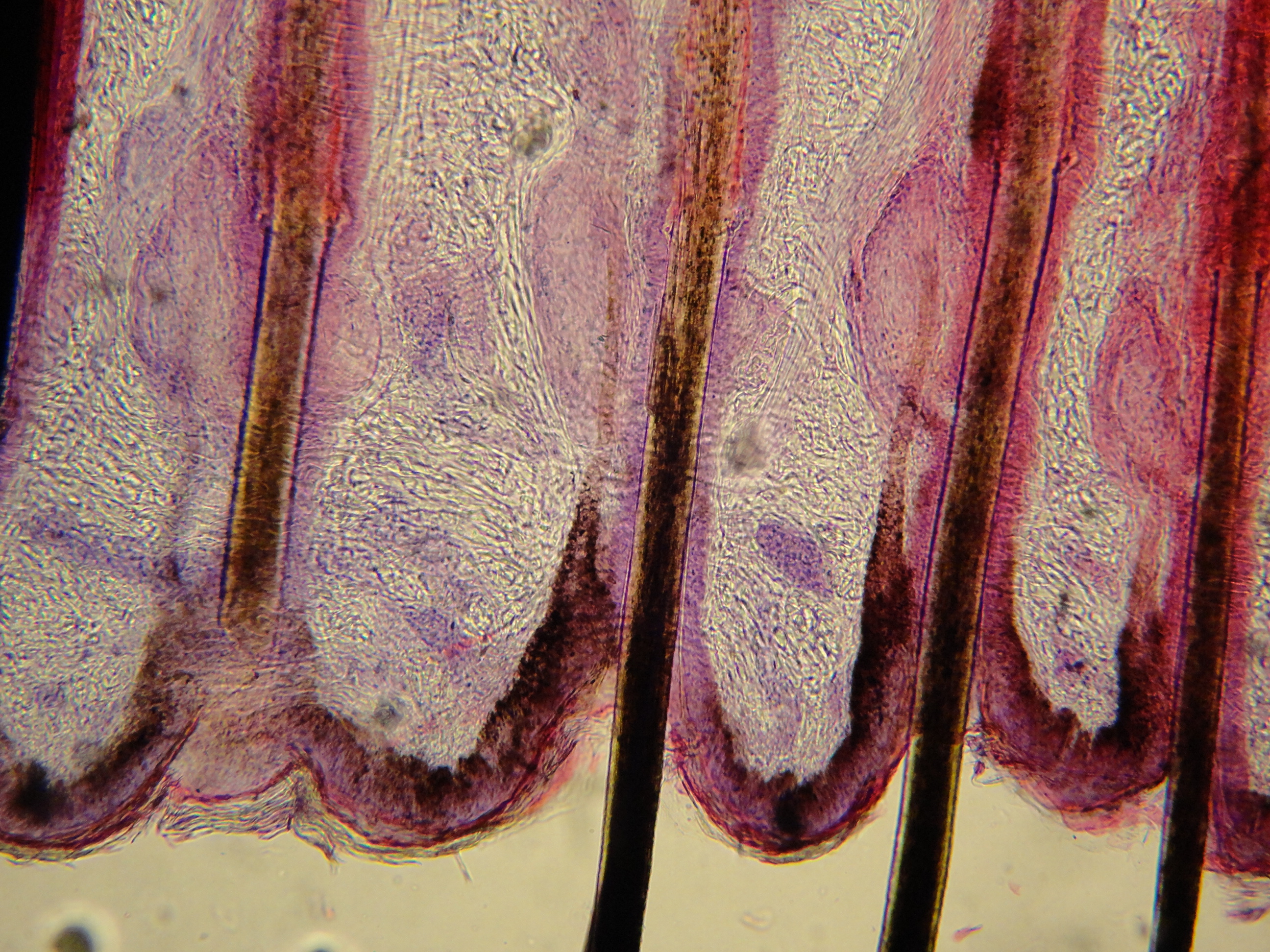 # 피부 아래에 있는 모낭 (또는 피부에서 뽑았을 때의 모구 또는 뿌리). 이 기관은 진피에 위치하며 줄기 세포를 유지한다. 줄기 세포는 털이 빠진 후 다시 자라게 할 뿐만 아니라 상처가 난 후 피부를 재생하는 데에도 동원된다.[2]