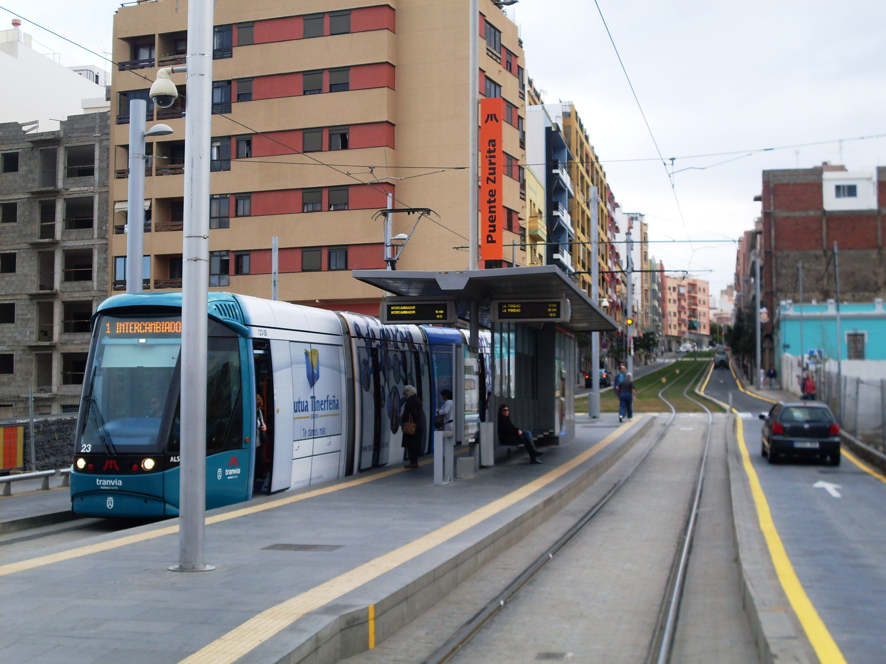 [[File:Tranvía_de_Tenerife1.jpg|thumb|right|250px|노면에서 운행되는 ''테네리페 트램''은 다른 교통수단과 분리되어 있다.
