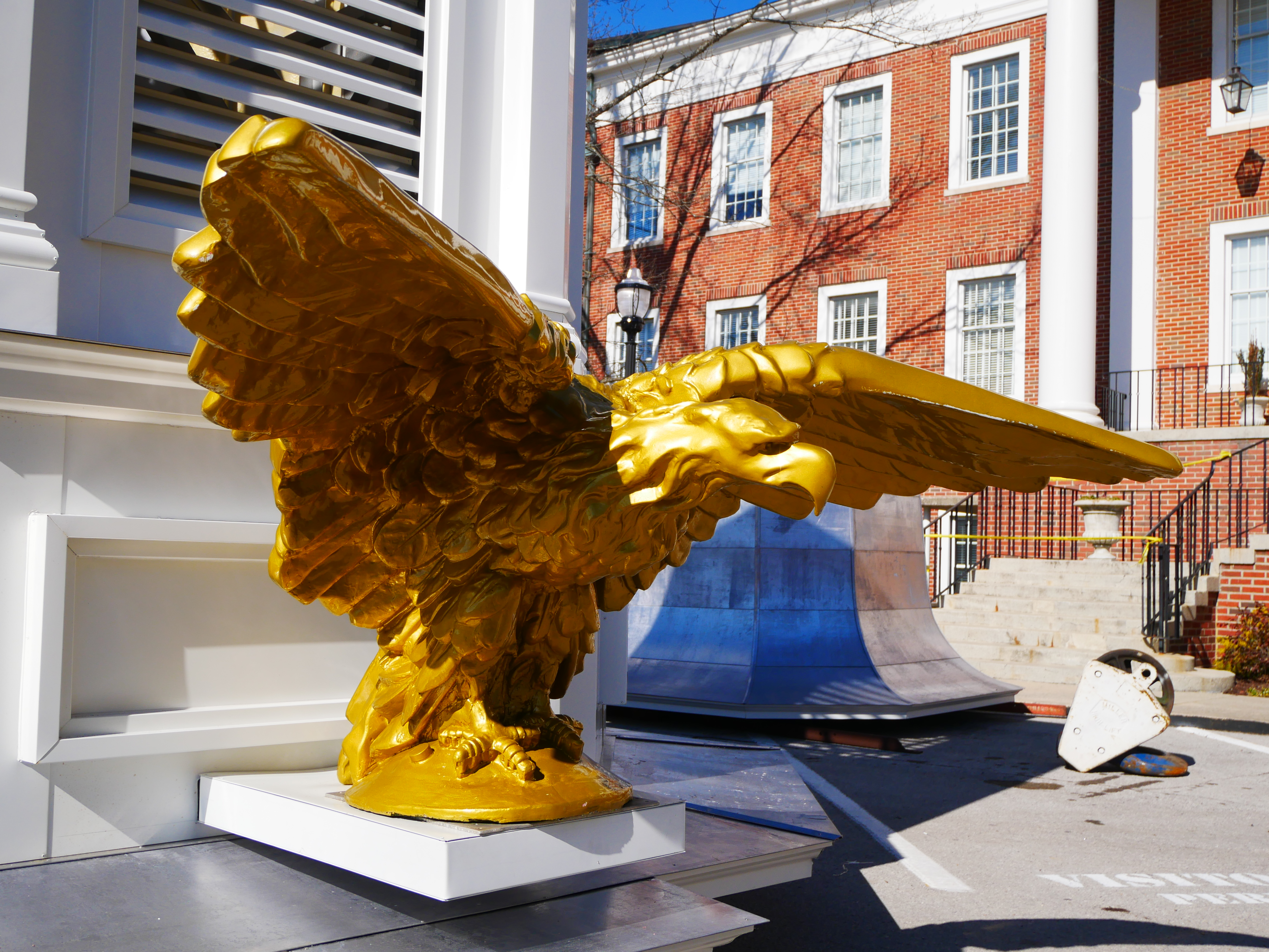 2022년 데리베리 홀의 돔을 교체하면서 임시로 땅에 놓인 독수리 조각상