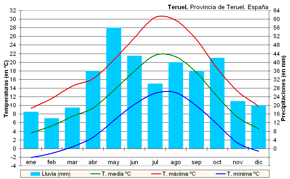 테루엘 기상 관측소에서 기록된 최고 기온은 2021년 8월 14일 41.3°C였고, 최저 기온은 2021년 1월 12일 -21°C였다.[7]