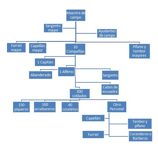 테르시오는 국왕이 임명한 마에스트레 데 캄포(지휘관)가 이끌었고, 8명의 핼버드 병사로 구성된 경호대가 있었다. 마에스트레 데 캄포를 보좌하는 인물로는 서전트 메이저와 물자와 무기 담당인 후리르 대장이 있었다. 중대는 (역시 왕이 임명한) 대위가 이끌었고, 소대기 장교가 중대기를 담당했다.[25]