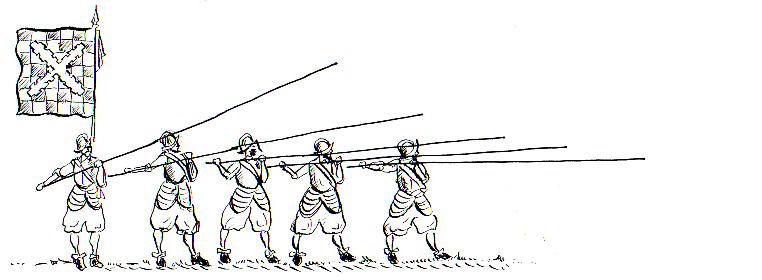 - A 중대: 본부요원 11명, 파이크병 108명, 코르셀렛(갑옷과 투구로 무장한 창병) 111명, 머스켓 총병 20명