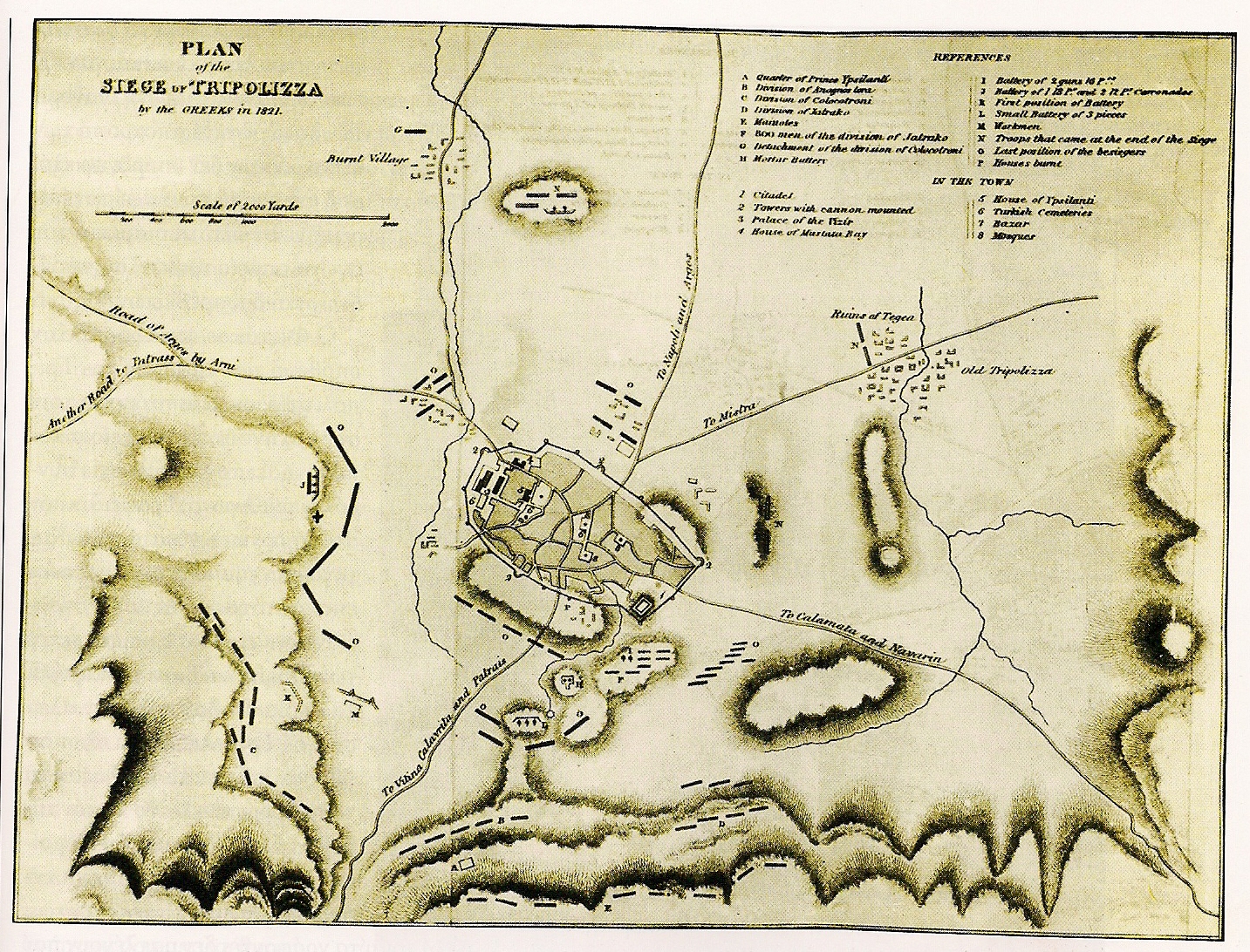 트리폴리스 공성전 계획. 도시를 포위한 콜로코트로니스 부대의 파견대는 "O" 문자로 표시되어 있다.