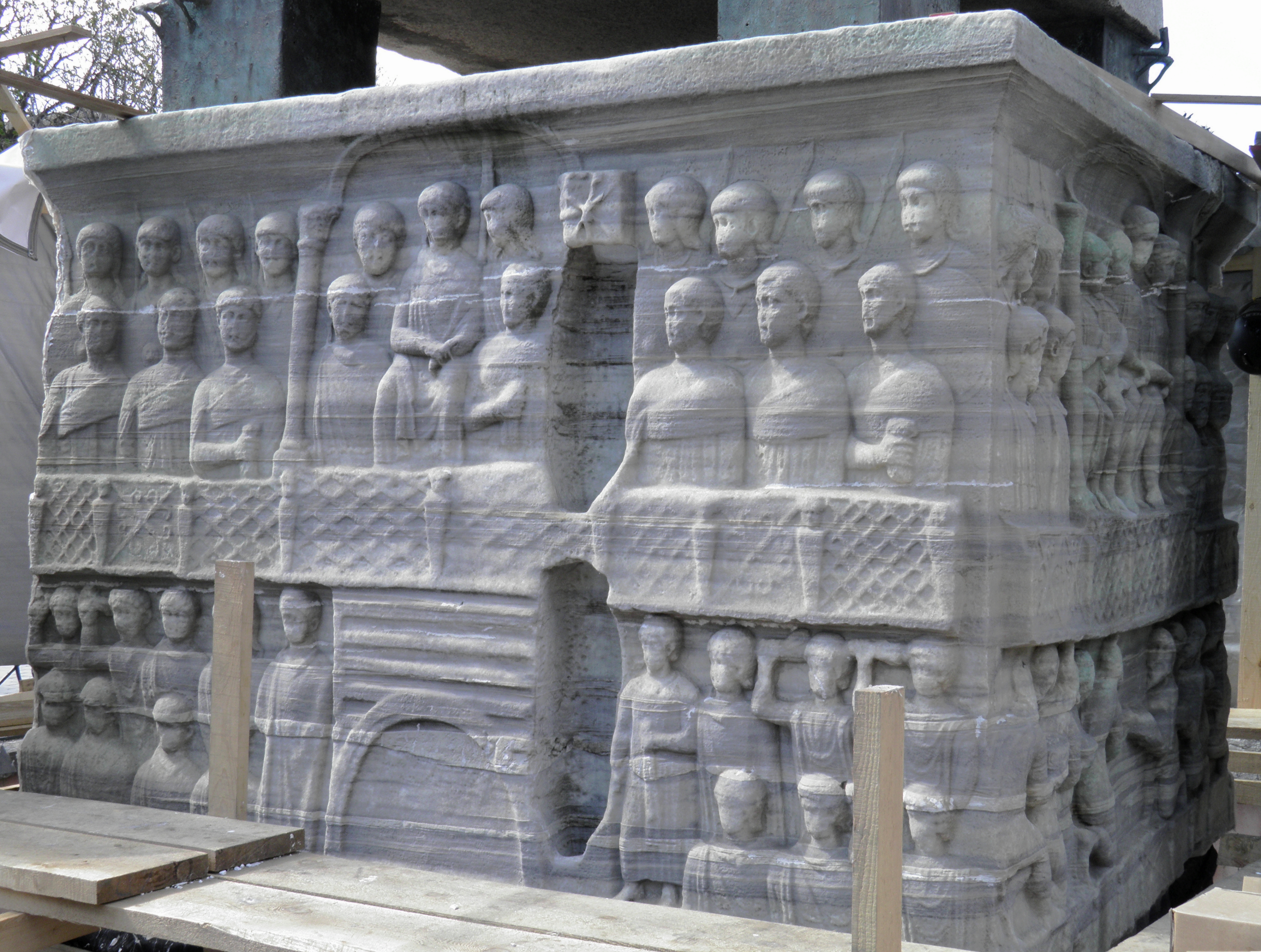 오벨리스크의 흰색 대리석 기단은 테오도시우스의 황실 가족과 콘스탄티노플로 오벨리스크를 옮기는 공학적 업적을 기록한 저부조로 완전히 덮여 있다. 테오도시우스와 황실 가족은 관중들 사이의 귀족들로부터 황실석에서 분리되어 있으며, 그들의 지위를 나타내는 덮개가 그들 위에 놓여 있다.[53] 스타일 측면에서 볼 때, 그것은 "일반적으로 초기 로마 고전주의의 '르네상스'로 묘사되는 소위 테오도시우스 궁정 양식을 식별하는 핵심 기념물" 역할을 했다.[53]