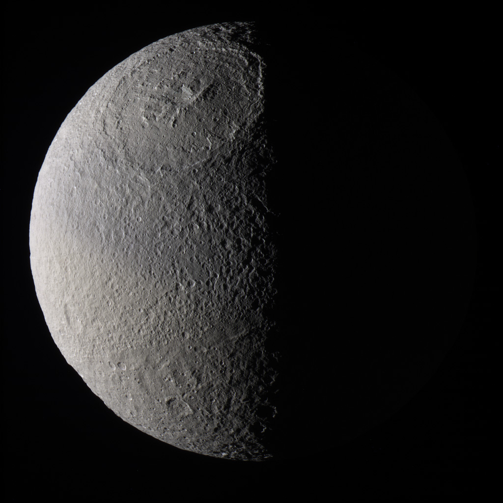 테티스 표면의 충돌구 밀도는 지역에 따라 다르다. 충돌구 밀도가 높을수록 표면 연대가 오래되었음을 의미한다. 과학자들은 이를 통해 테티스의 상대 연대기를 확립할 수 있다. 충돌구 지형은 가장 오래된 단위로, 약 45억 6천만 년 전 태양계 형성 시대로 거슬러 올라갈 가능성이 높다. 가장 젊은 단위는 오디세우스 충돌구 내부에 있으며, 절대 연대기법에 따라 37억 6천만 년에서 10억 6천만 년 사이로 추정된다. 이타카 카스마는 오디세우스보다 오래되었다.5. 기원과 진화