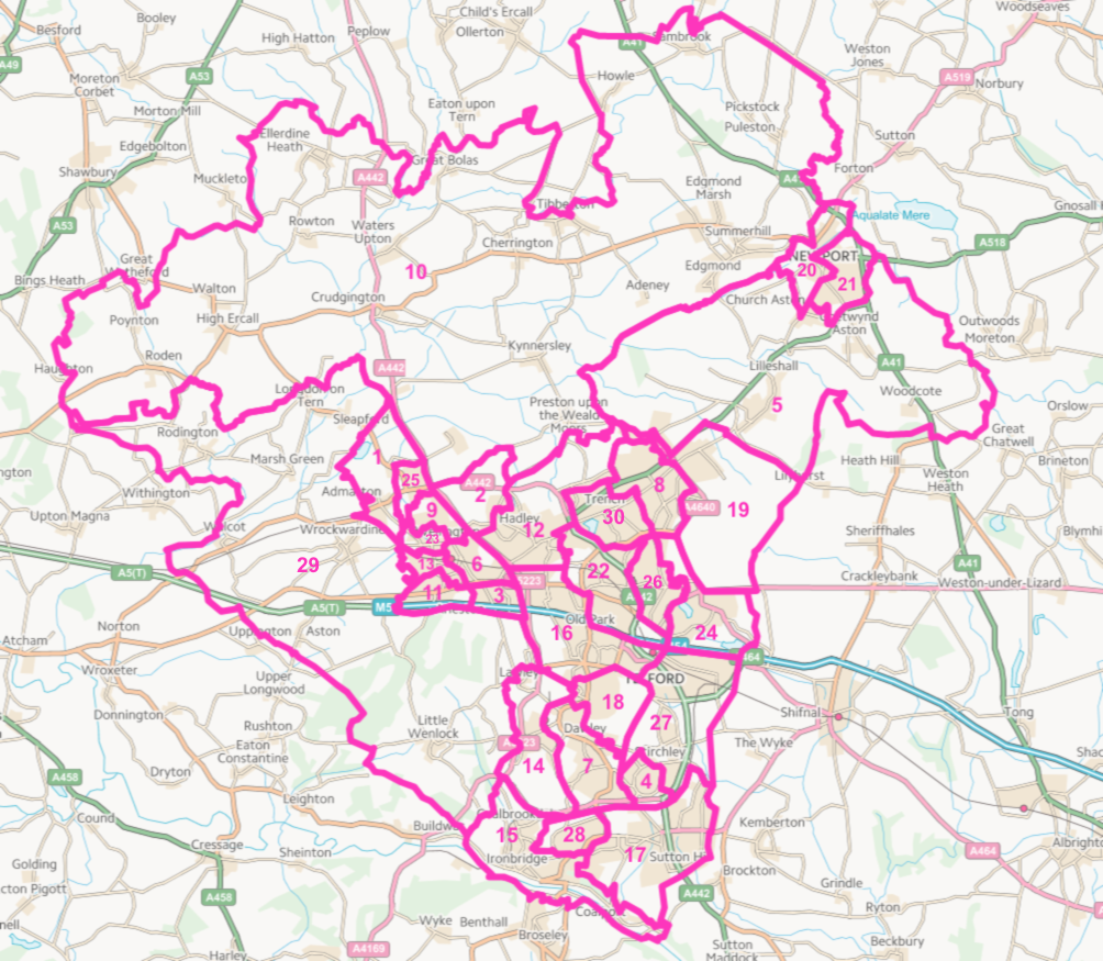 쉬프널 농촌 자치구에서 텔포드 신도시의 지정 구역 내에 있는 쉬프널 교구의 일부 (릴리셜 교구에 추가됨)[3] |