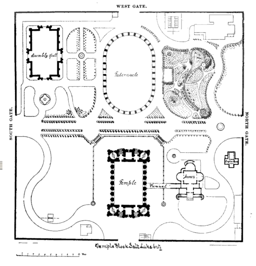 1847년, 브리검 영이 이끄는 몰몬 개척자들이 솔트레이크 계곡에 도착했을 때, 회장 브리검 영은 사막 땅의 한 구획을 선택했고, 처음에는 "템플 블록"이라고 불렀으며,[4] "우리는 이곳에 우리 하느님을 위한 성전을 지을 것이다."라고 선언했다.[5] 도시가 측량되었을 때, 그 위치를 둘러싼 블록은 성전을 위해 지정되었고, 템플 스퀘어로 알려지게 되었다. 템플 스퀘어는 블록이 그렇게 지정된 직후에 건설된 15피트 높이의 벽으로 둘러싸여 있다.