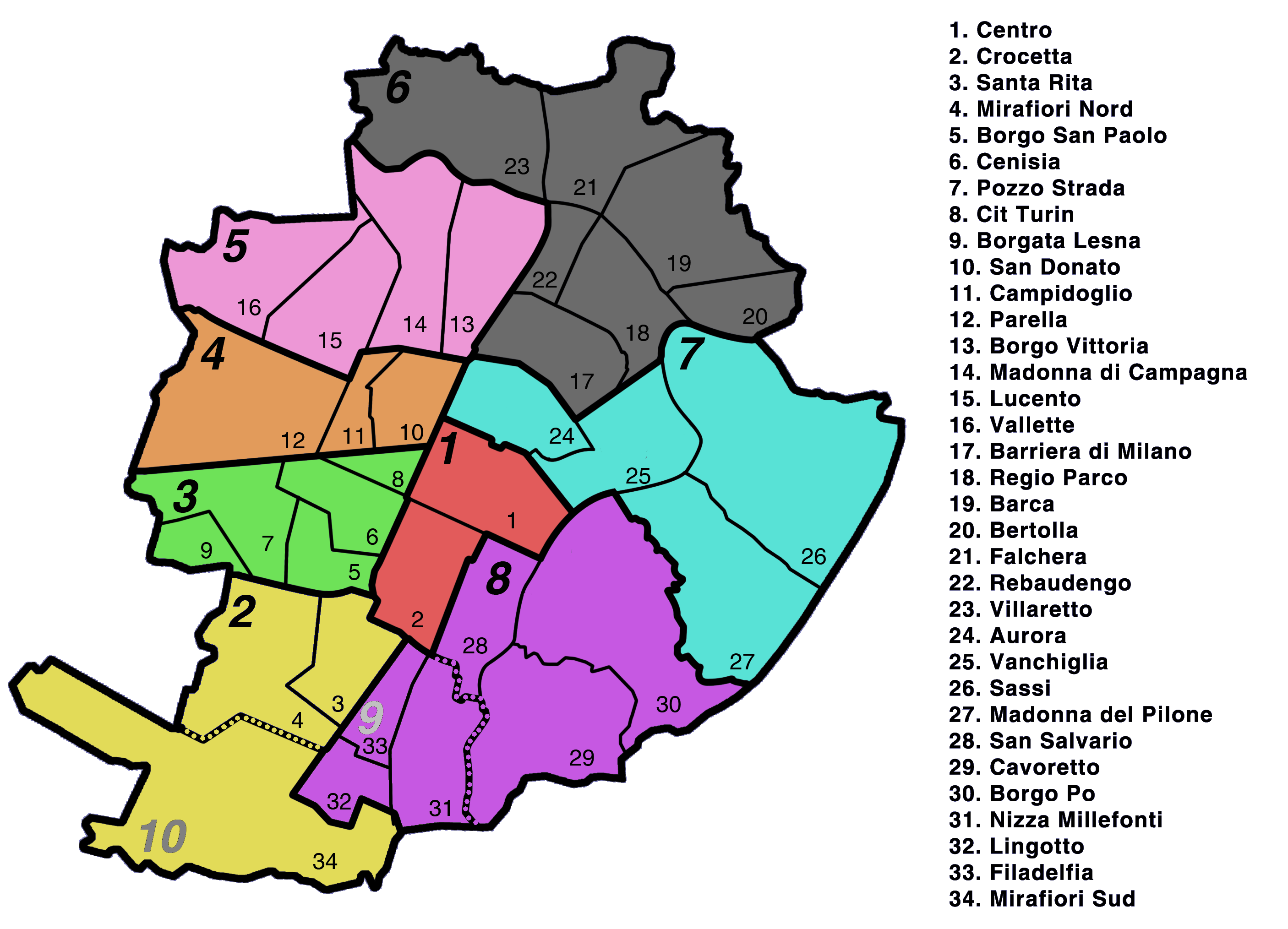 토리노는 '치르코스크리초네'(''circoscrizioni'')라고 불리는 8개의 자치구로 나뉜다. 이것들은 '콰르테리'(quartieri), '리오니'(''rioni''), '보르그히'(''borghi''), '보르가테'(''borgate'') 또는 '조네'(''zone'')라고 불리는 도시의 역사 지구와 반드시 일치하지는 않는다. ‘치르코스크리초네’ 시스템은 원래 10개였으나, 9구를 8구로, 10구를 2구로 병합하여 8개로 줄였다.