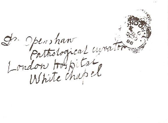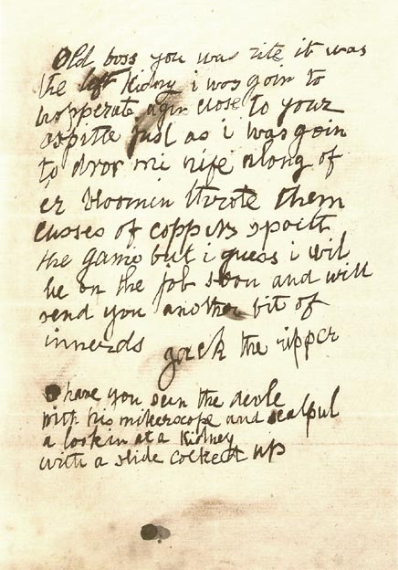 > ''Old boss you was rite it was the left kidny i was goin to hoperate agin close to your ospitle just as i was going to dror mi nife along of er bloomin throte them cusses of coppers spoilt the game but i guess i wil be on the job soon and will send you another bit of innerds''