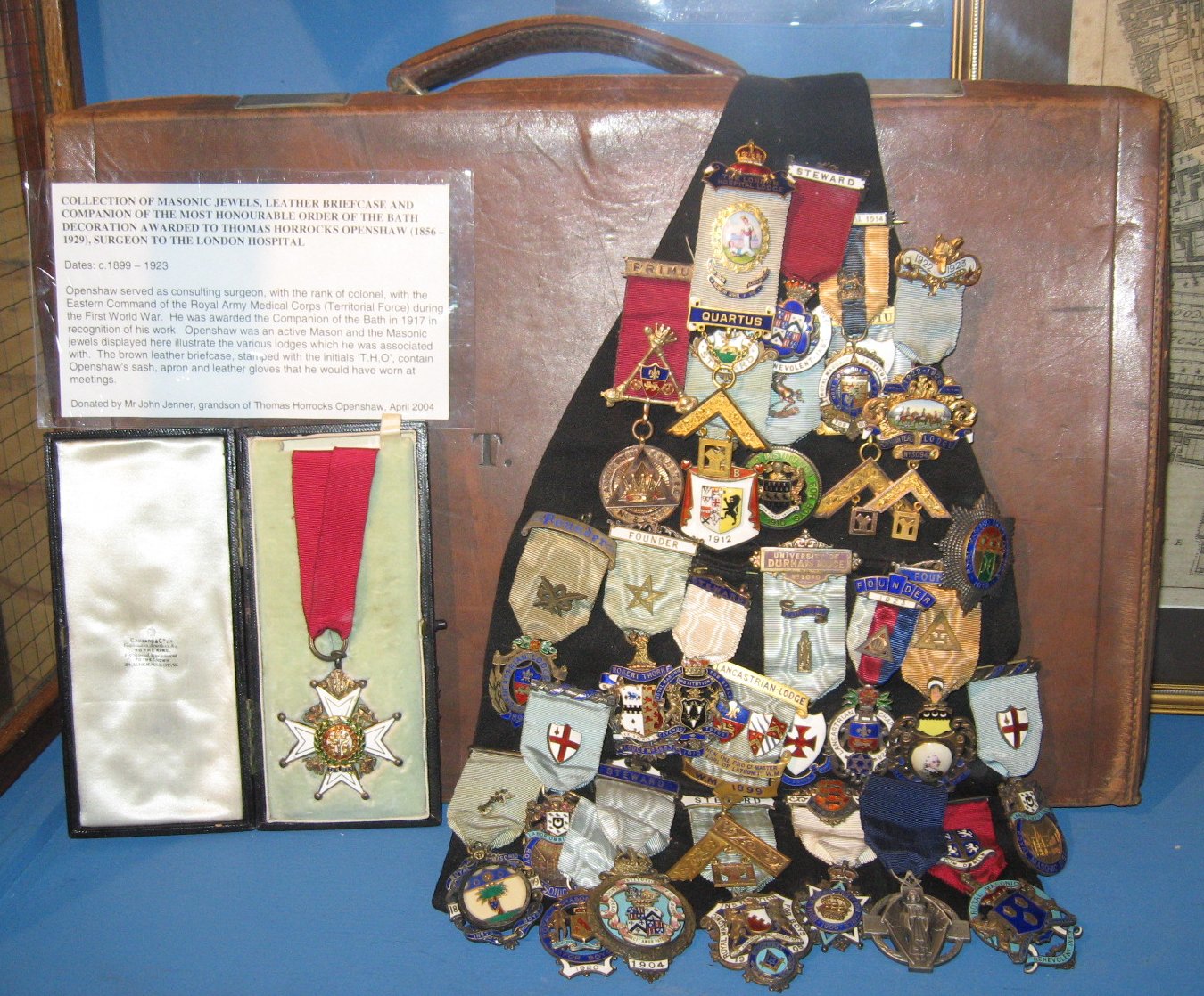 오픈쇼의 목욕 기사단 훈장과 프리메이슨 훈장이 로열 런던 병원에 전시되어 있다.