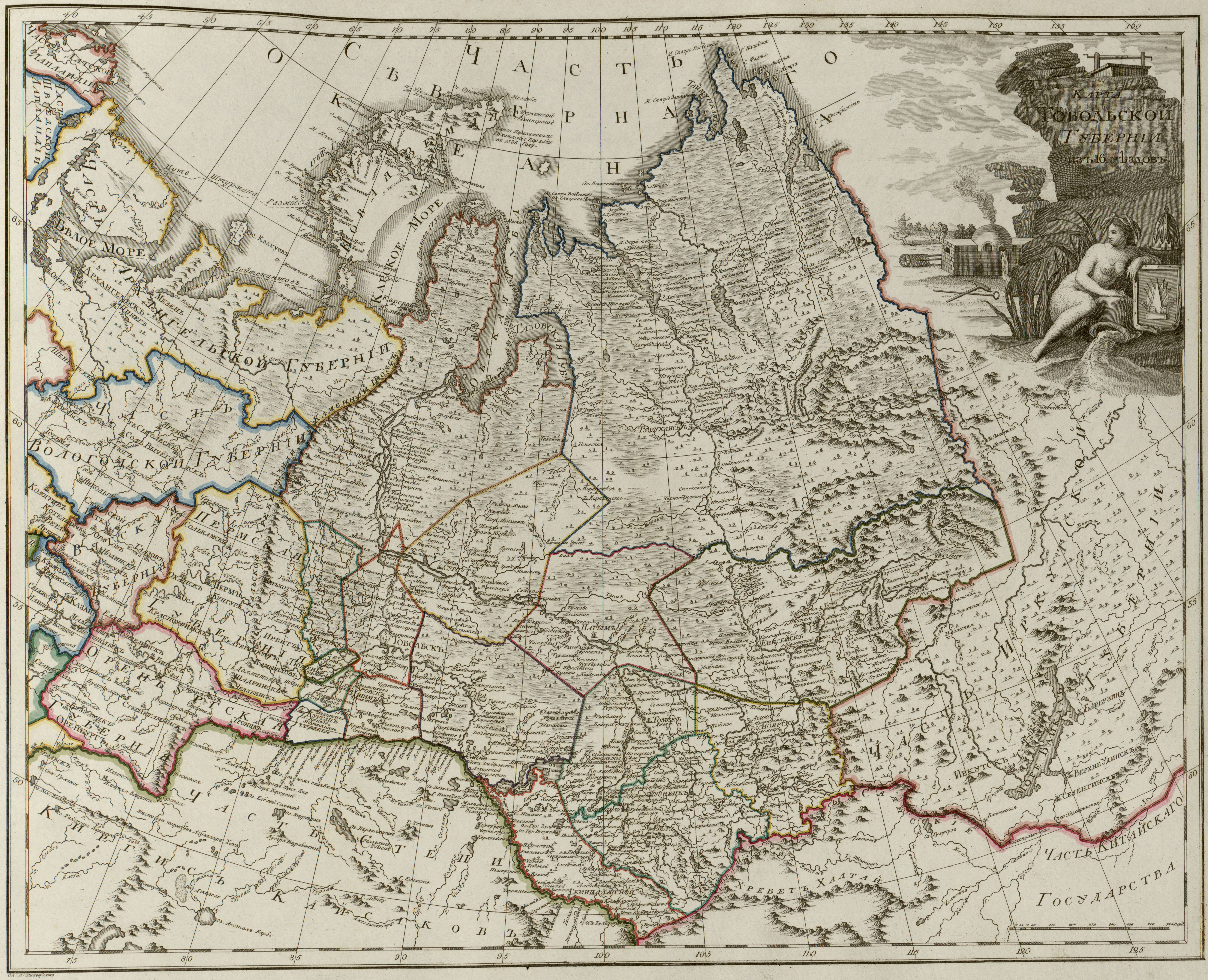 1800년에 알렉산드르 빌브레흐트 미하일로비치(Вильбрехт, Александр Михайлович|빌브레흐트, 알렉산드르 미하일로비치ru)가 제작한 "41개 주로 구성된 43개의 지도 러시아 아틀라스"에는 토볼스크 현(16개 군)의 지도가 포함되어 있다. 이 지도는 토볼스크 주의 광대한 시베리아 지역과 관할 구역의 경계, 인구 밀집 지역, 수도원, 겨울 야영지, 요새, 광산, 소금 및 어업 지역을 보여준다. 또한 스테판 말리긴(1734, 1735), 알렉세이 이바노비치 스쿠라토프(1734, 1735), 드미트리 오브친(1735), 스테판 보이노비치 무라비요프(1737), 파블로프 미하일 스테파노비치(1737), 로즈미슬로프 표도르(1768)의 항해 경로와 1596년 네덜란드 선박의 겨울 휴식지도 표시되어 있다. 지도의 제목은 사냥 장면, 광산 기호, 그리고 오비강을 상징하는 항아리를 든 소녀 그림이 있는 예술적인 카르투슈 안에 담겨 있다.[5]