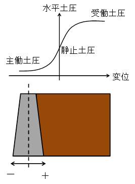 수평 토압은 흙막이 구조물에 변위가 없는 경우의 정지 토압, 흙이 팽창하여 파괴되는 순간의 주동 토압, 흙이 압축되어 파괴되는 순간의 수동 토압, 이렇게 세 가지로 구분된다.[2] 정지 토압은 지하 배수구, 박스 암거, 지하실 벽체 등 변위를 거의 허용하지 않는 구조물에 작용하는 토압을 계산하는 데 사용된다. 주동 토압은 옹벽이 뒤채움 흙의 압력으로 전도될 때 작용하며, 수동 토압은 벽체가 외력을 받아 뒤채움 흙쪽으로 눌릴 때 발생한다.