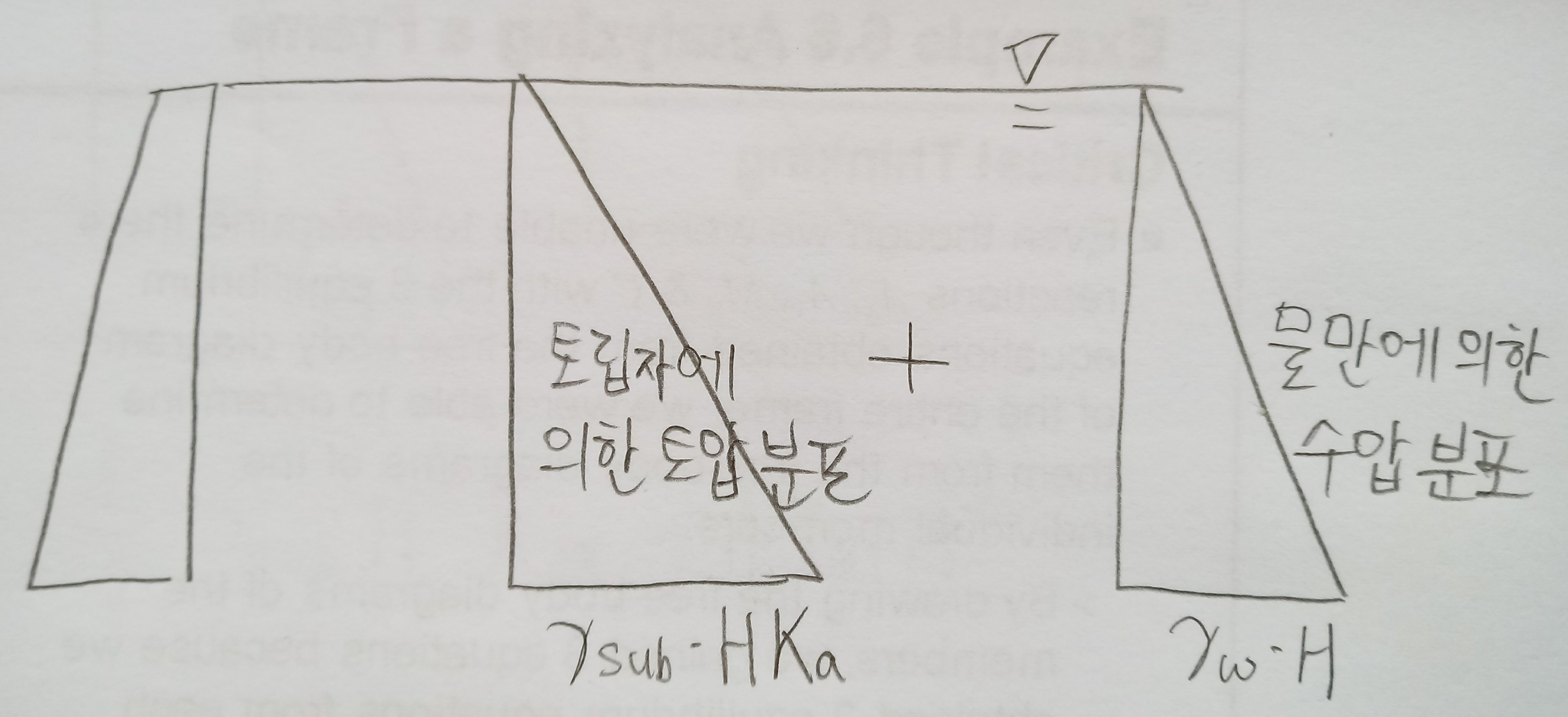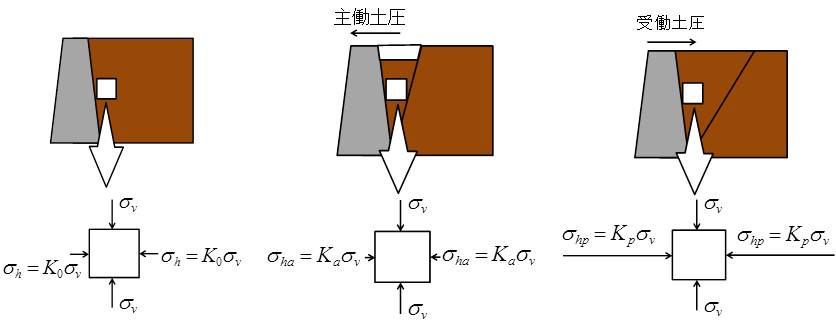 각 지반의 상태는 위 그림과 같으며, , , 는 각각 정지 토압 계수, 주동 토압 계수, 수동 토압 계수를 나타낸다.