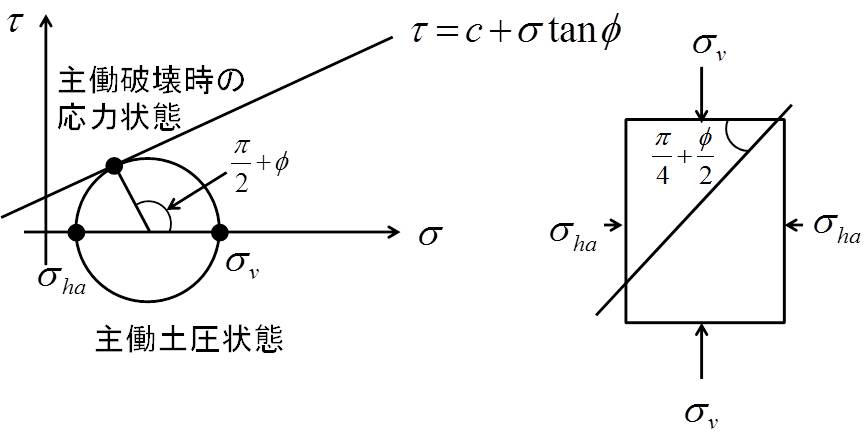 : 주동 토압 시, 최대 주응력은 , 최소 주응력은 이므로, 위 식에 대입하면 다음 식을 얻는다.