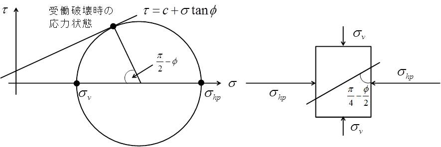 : 수동 토압 시, 최대 주응력은 , 최소 주응력은 이므로, 위 식에 대입하면 다음 식을 얻는다.