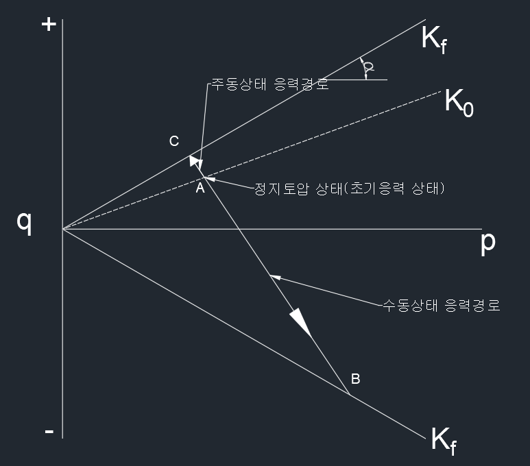 사질토에 대한 응력경로는 위 그림과 같다. 정지토압 상태는 K0 선 상에, 주동 또는 수동토압으로 인해 파괴된 경우는 Kf 선상에 있어야 한다.