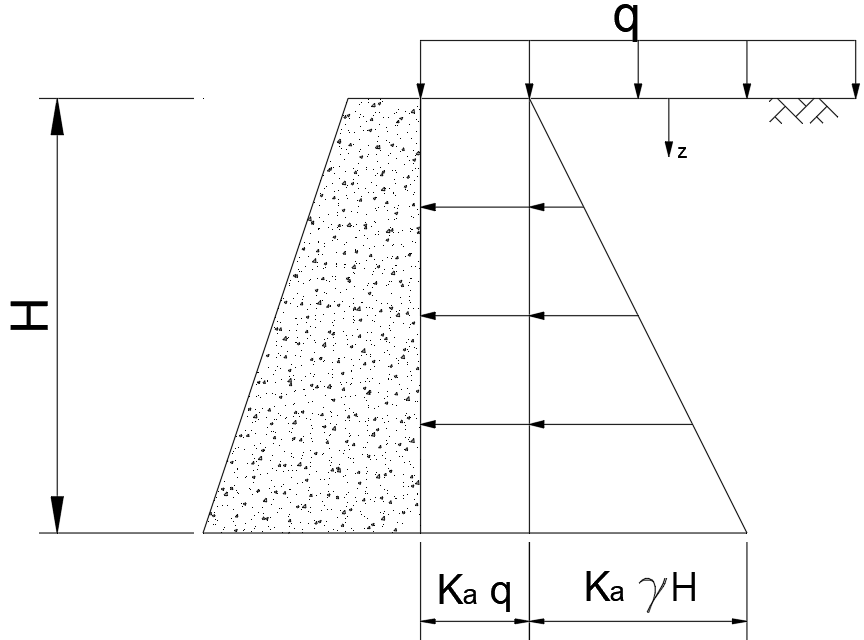 옹벽 위의 테라스에 균일한 압력 하중이 가해지는 경우, 는 이 압력에 와 벽 높이를 곱한 것과 같다. 이것은 테라스가 수평이거나 벽이 수직인 경우에 적용된다. 그렇지 않으면 에 를 곱해야 한다.