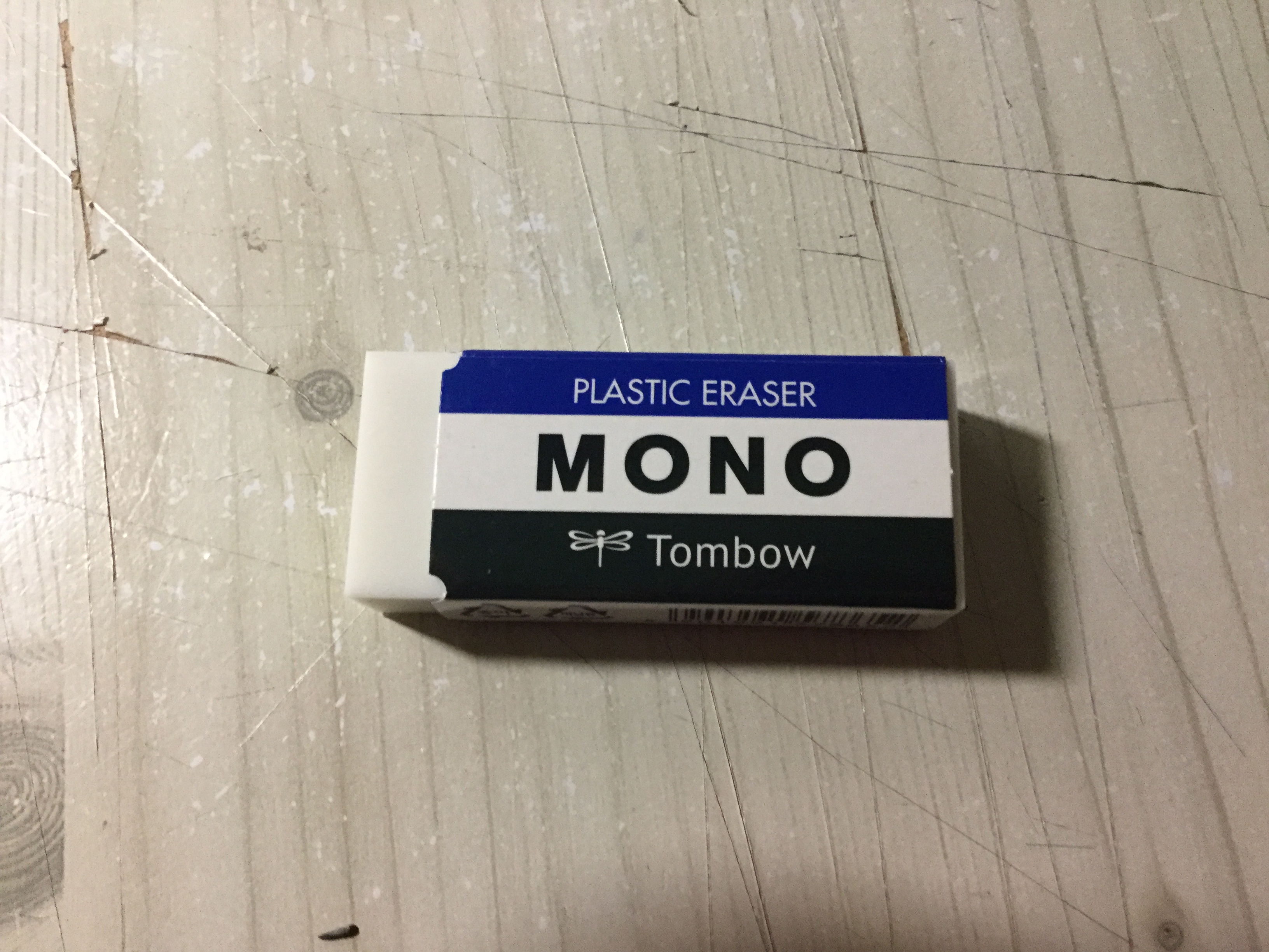 MONO 지우개는 롱셀러 플라스틱 지우개로, 처음에는 톰보 연필의 최고급 연필 "MONO100"의 부속품이었지만, 호평을 받아 1969년에 제품화되었다. 파랑, 흰색, 검정색의 세 가지 색상의 스트라이프가 특징인 디자인으로, 2017년에는 일본 최초의 색채 상표로도 등록되었다. 2011년 굿 디자인·롱 라이프 디자인 상을 수상했다. 표준 "PE" 타입 외에, 가벼운 힘으로 지우기 쉬운 "라이트" 및 지우개 가루가 뭉쳐지는 "논 더스트", 검정색 타입, 스틱형, 노크식 등 다양한 종류가 있다.[35]
