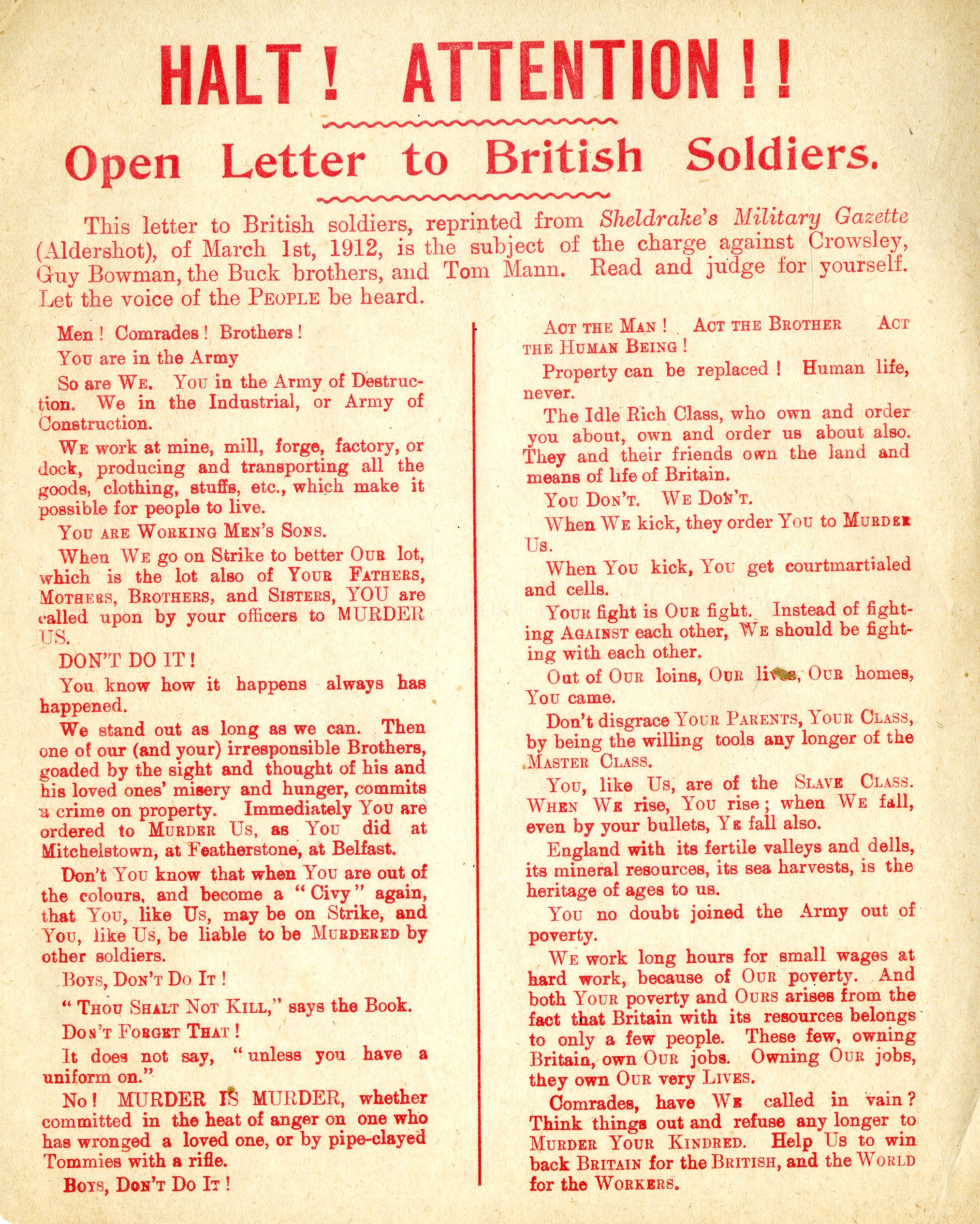 1912년, 톰 만은 The Syndicalist에 "Open Letter to British Soldiers|영국 군인들에게 보내는 공개 서한eng"이라는 제목의 글을 발표했다. 이 글은 파업 노동자들에게 군인들이 발포하지 말 것을 촉구하는 내용을 담고 있었으며, 나중에 "Don't Shoot|발포 금지eng"라는 제목의 전단으로 재인쇄되기도 했다. 이 글로 인해 그는 반란 선동법 1797 위반 혐의로 유죄 판결을 받았으나, 대중적인 항의와 압력으로 인해 그의 징역형은 결국 취소되었다.