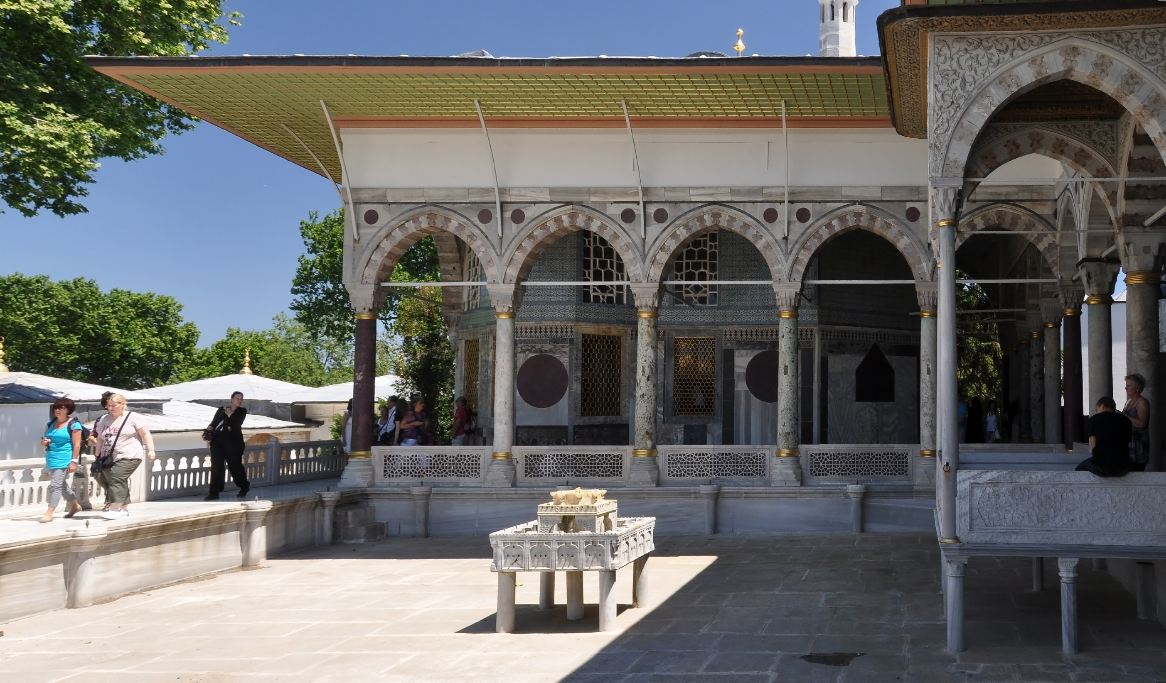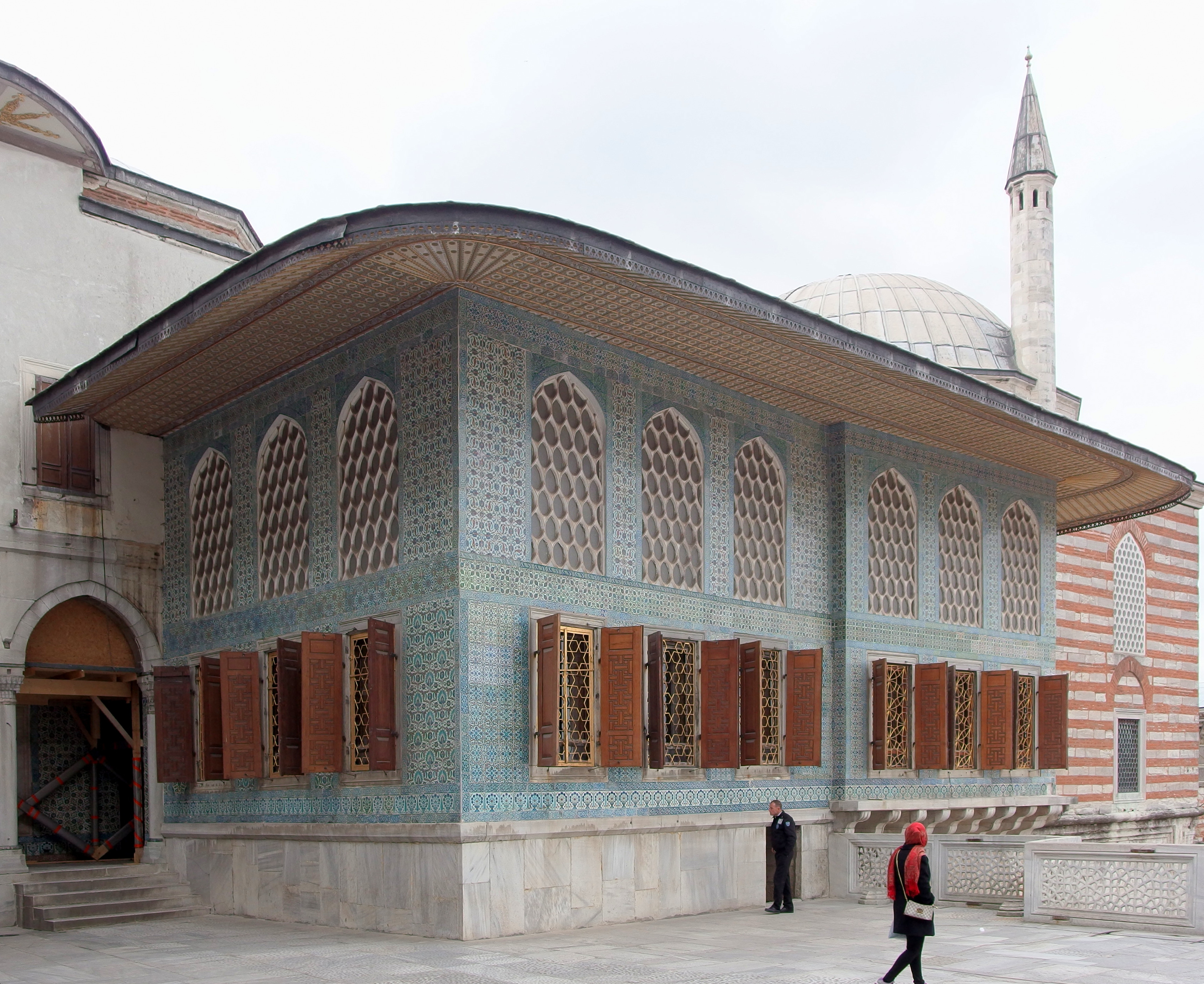 예레반 키오스크와 매우 유사하며, 현관의 세 개의 문은 소파 사이에 위치해 있다. 외관은 대리석, 반암 조각, 녹색 대리석으로 덮여 있다. 현관의 대리석 패널은 카이로 마므루크 양식으로 제작되었다. 내부는 이상적인 오스만 방의 모습을 보여준다.[68] 벽감 선반과 찬장은 16세기 초의 녹색, 노란색, 파란색 타일로 장식되어 있다. 벽의 청백색 타일은 테라스 건너편에 있는 할례실의 타일을 복제한 것이다. 17세기의 타일, 자개, 거북이 껍질로 장식된 찬장과 창문 패널을 갖춘 이 정자는 고전적인 궁전 건축의 마지막 예 중 하나이다.