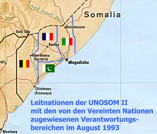 오스트레일리아의 제1 왕립 호주 연대(1993년 1월~5월), 방글라데시, 벨기에, 보츠와나, 캐나다, 이집트(1개 대대), 에티오피아, 프랑스(여단 본부 및 1개 대대), 독일, 그리스(와지드 의료 부대), 인도 육군(바이도아 여단 본부 및 3개 대대), 아일랜드(수송 부대), 이탈리아, 쿠웨이트, 모로코, 뉴질랜드의 제40 비행대대 RNZAF 병력, 나이지리아, 노르웨이, 파키스탄, 사우디아라비아, 스페인, 스웨덴, 튀니지, 터키, 아랍에미리트, 영국, 짐바브웨가 UNITAF에 병력을 파견했다.[10] 이들 국가 파견대는 미국 중부사령부의 조정 및 감독을 받았지만, 센트컴과 기여 국가 간의 관계는 다양했다.[13]5. UNOSOM II로의 전환