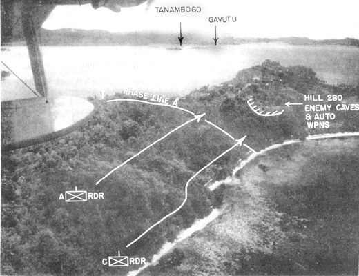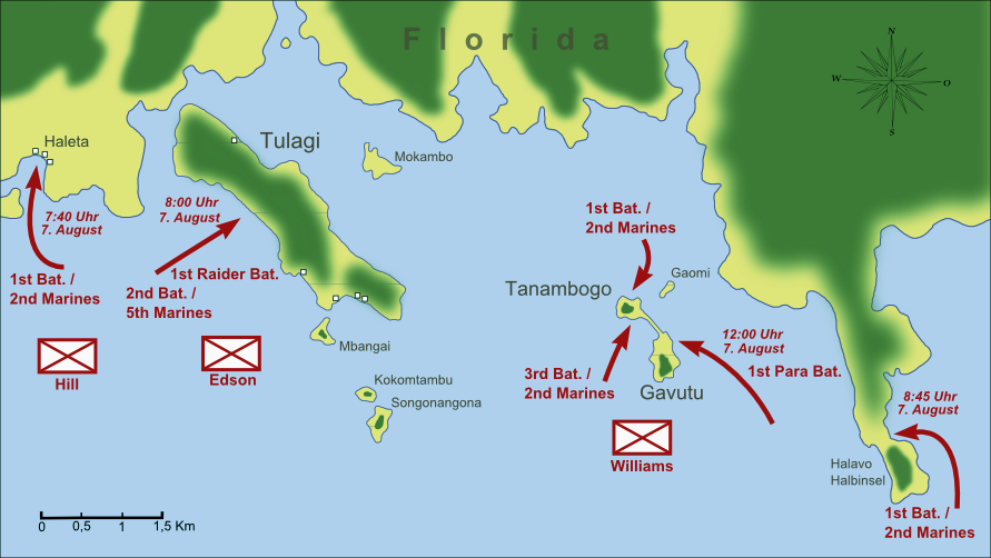 순양함 과 구축함 , 는 툴라기와 플로리다 섬의 계획된 상륙 지점을 포격했다.[22] 툴라기, 가부투, 타남보고에 대한 공격을 지원하기 위해 제2해병연대 제1대대의 미국 해병대는 07시 40분에 플로리다 섬에 무혈 상륙했다.[22]