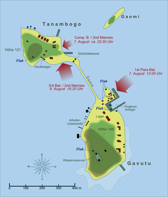 1942년 8월 7일 12:00, 미 해병대 제1 공수대대가 397명의 병력으로 가부투섬에 대한 공격을 개시했다. 과달카날, 툴라기, 가부투섬 모두에서 벌어지는 상륙작전에 동시에 공중지원을 할 수 없어, 상륙 시점이 정오가 되었다.[86] 해군의 함포 지원사격으로 수상기용 선착장이 손상되어, 상륙군은 노출된 해안에 접안해야 했고, 이 과정에서 일본군의 화망에 노출되어 10%에 이르는 사상자가 발생했다.[87]