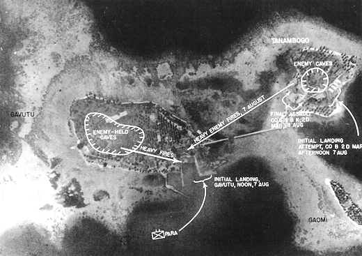 당시 타남보고섬을 방어하던 일본군은 요코하마 비행대 소속으로, 비행사, 정비병, 건설대 소속이라 전투 장비가 충분하지 않았다. 낫과 죽창으로 무장한 병력도 있었다.[92] 루퍼터스 장군은 미 해병 2사단 1대대에서 1개 중대를 차출하여 타남보고섬 공격을 지원하도록 했다. 참모들은 1개 중대가 충분하지 않을 것이라고 조언했지만, 루퍼터스 장군은 타남보고의 방어 수준이 높지 않을 것으로 오판했다. 차출된 B 중대는 8월 7일 저녁 미 해군의 함포 공격으로 발생한 화재를 조명 삼아 상륙을 시도했다. 중대원을 수송하던 5척의 상륙정은 해안 접근 과정에서 중화기 공격을 받아 다수의 상륙정 승무원 사상자가 발생했고, 3척은 심하게 손상되었다. 중대장은 남은 상륙정에 부상자를 싣고 후퇴할 것을 명령하고, 12명의 대원과 가부투섬 방향으로 퇴각했다. 이날 일본군은 타남보고섬에서 10명이 전사했다.[93]