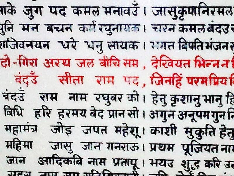 데바나가리 IAST मैं पुनि निज गुर सन सुनी कथा सो सूकरखेत। maı̐ puni nija gura sana sunī kathā so sūkarakheta । समुझी नहिं तस बालपन तब अति रहेउँ अचेत॥ samujhī nahi̐ tasa bālapana taba ati raheu̐ aceta ॥