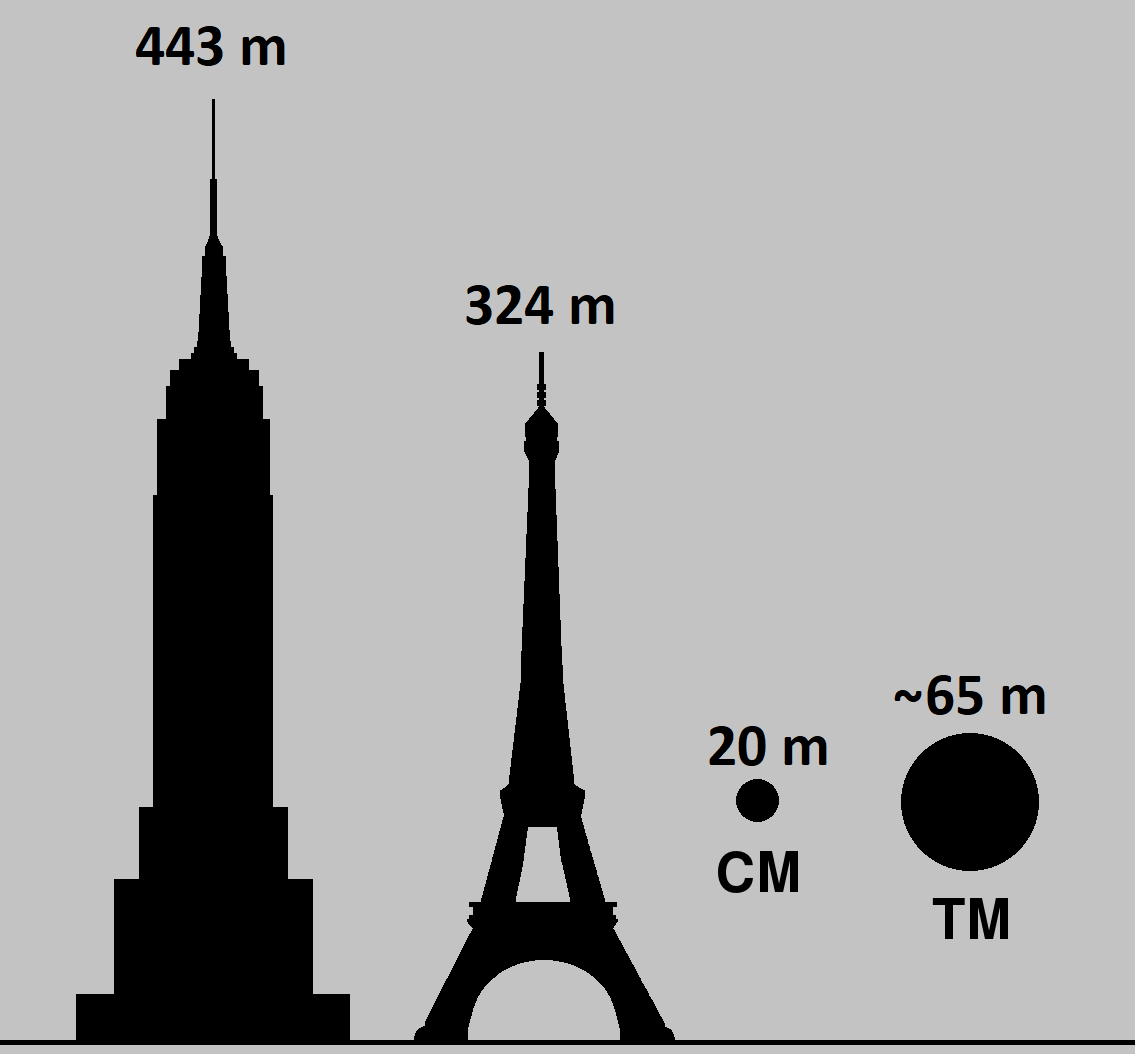 퉁구스카(TM 마크)와 첼랴빈스크(CM) 유성체의 가능한 크기를 에펠탑엠파이어 스테이트 빌딩과 비교