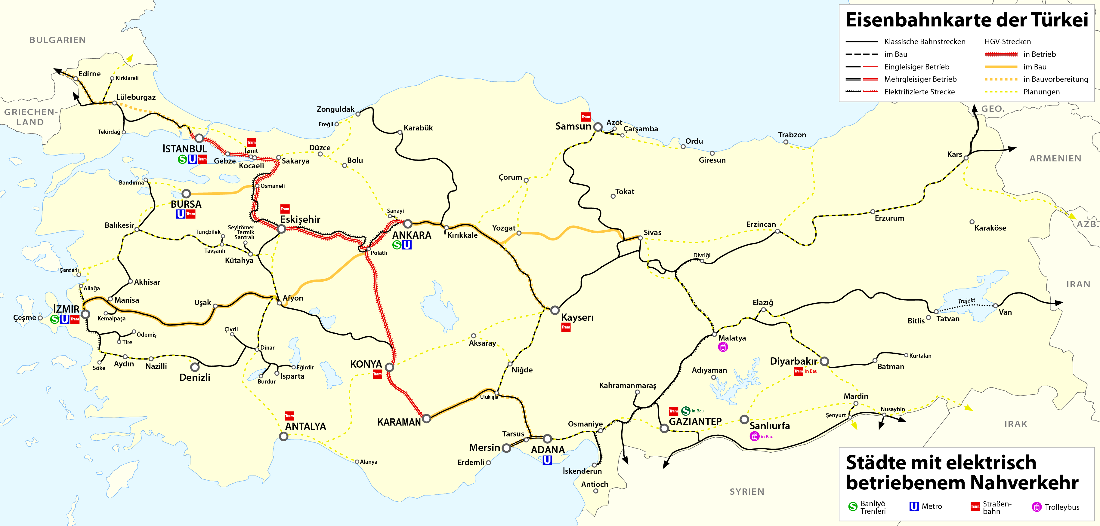 통근 철도 | 이스탄불, 앙카라, 이즈미르, 사카리아, 가지안테프 |