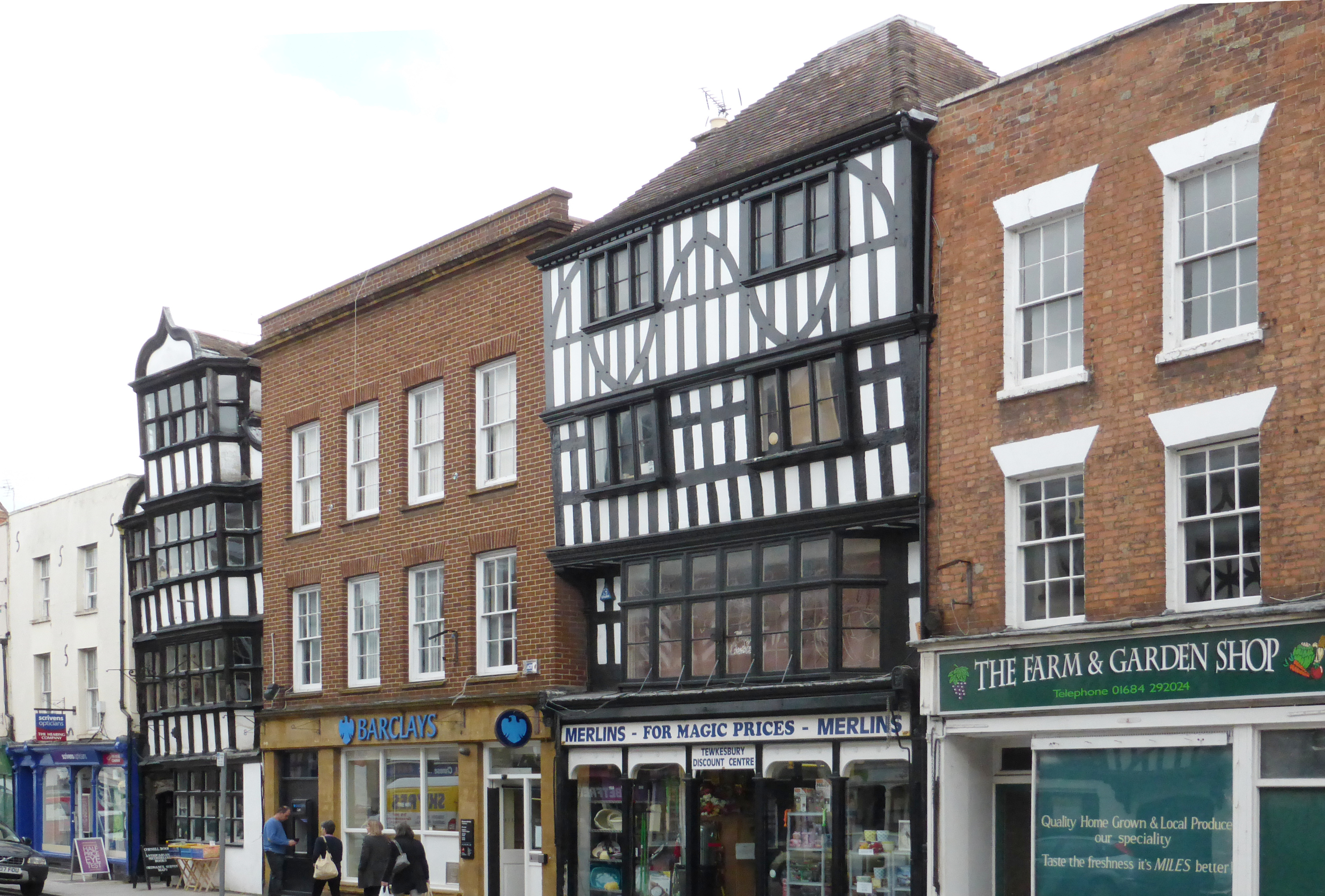 튜크스베리 하이 스트리트의 흑백 건물. 왼쪽 건물은 c.1510년에 지어졌으며, c.1650년에 외관이 개조되었다.