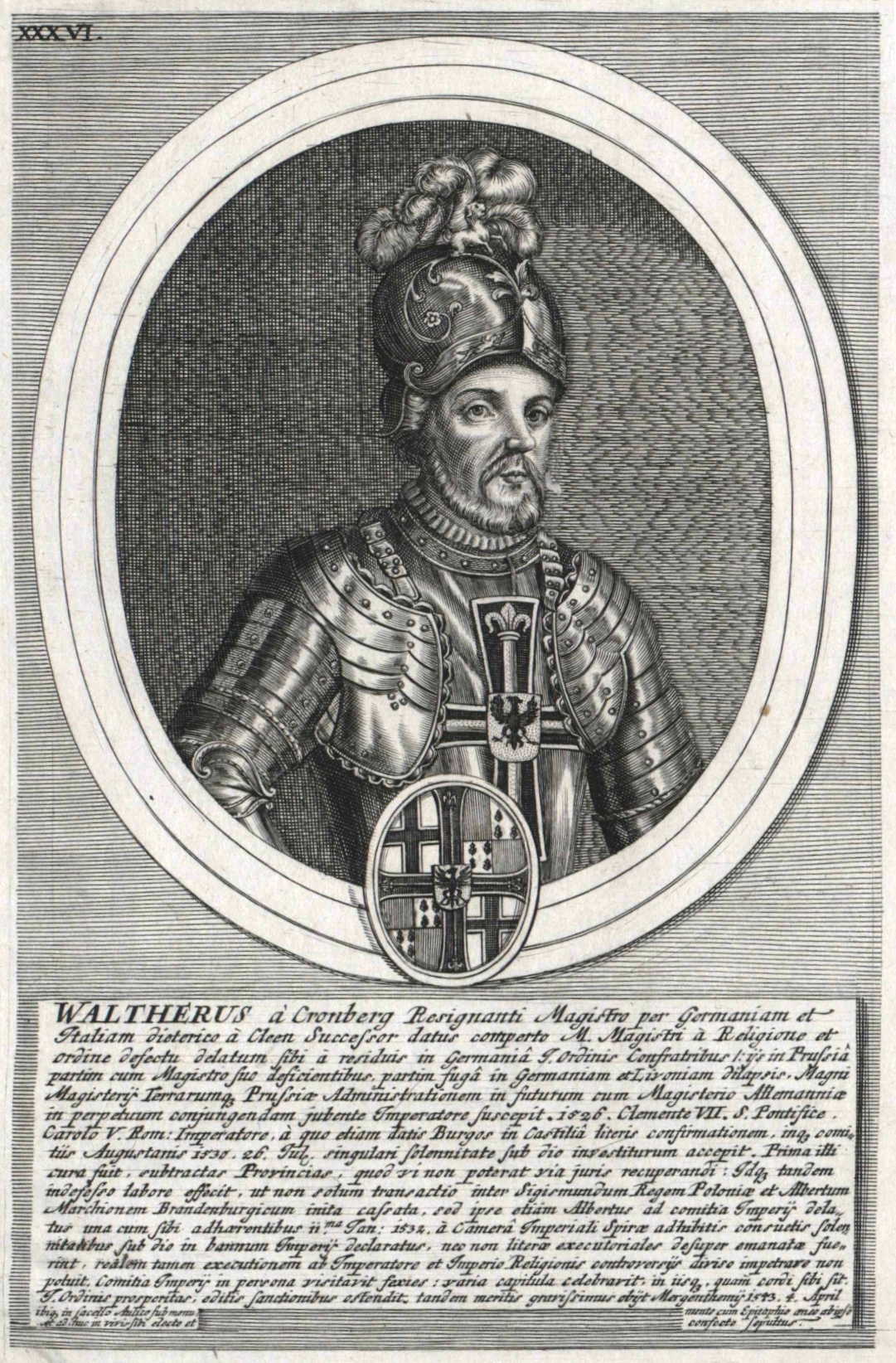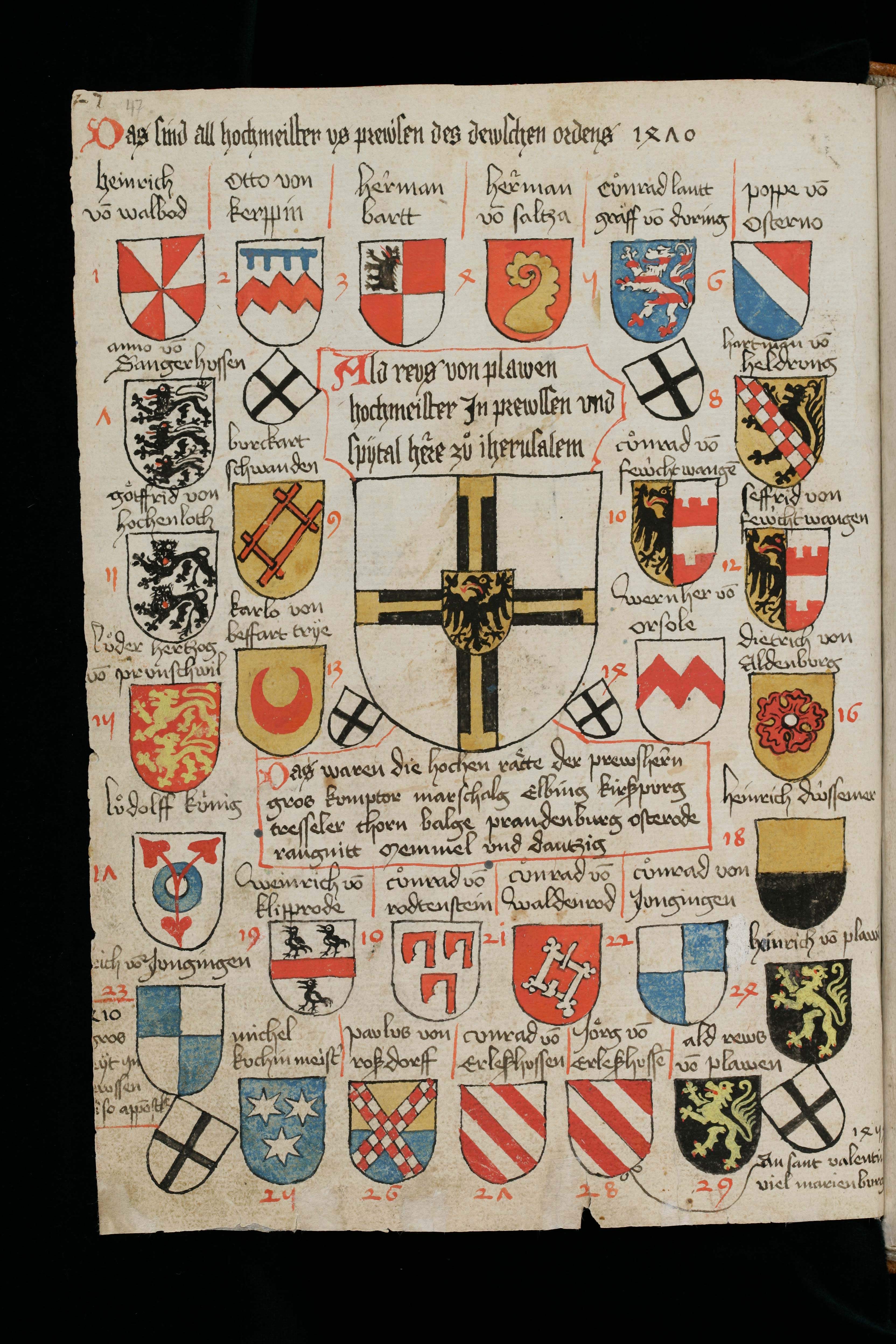 튜턴 기사단은 1198년부터 1525년까지 37명의 총장을 배출한 영적인 기사단이다.[16] 15세기와 16세기 초 울리히 리헨탈의 ''연대기''[12], 뉘른베르크에 보관된 장크트 갈렌 문장집[13], 라이프치히에 보관된 남서 독일 문장집[14], 밀텐베르크 문장집[15] 등 여러 문장집에서 총장의 문장을 묘사하고 있다.